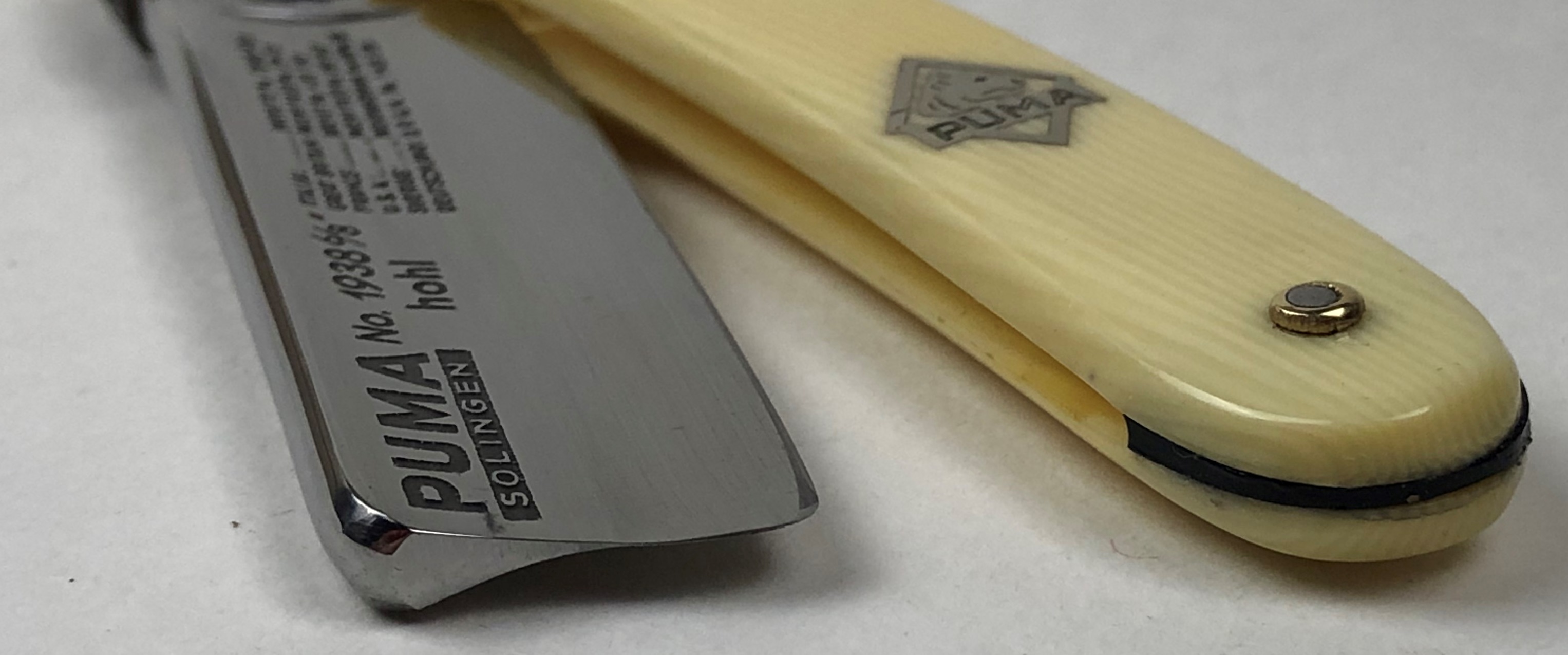 На мой взгляд, самая редкая и красивая модель.Бритва в очень хорошем состоянии, без следов пользования.Была разобрана для удалении следов патины и ржавчины в районе осевого пина.Сами пины были заменены на двух-цветные втулки, с добавлением внутренних шайб.Само полотно имеет оригинальную шлифовку и полировку.Идеальная геометрия клинка:кромочка равномерна по всей длине.Фирменная резинка в прекрасном состоянии и прослужит еще очень долго.Родной бакелитовый кейс в наличии. На сегодняшний момент эта вторая Пума, которая у меня сейчас имеется и от более дорогой, нетронутой, данный экземпляр практически ничем не отличается, но цена заметно ниже. Бритва заточена и готова к бритью.