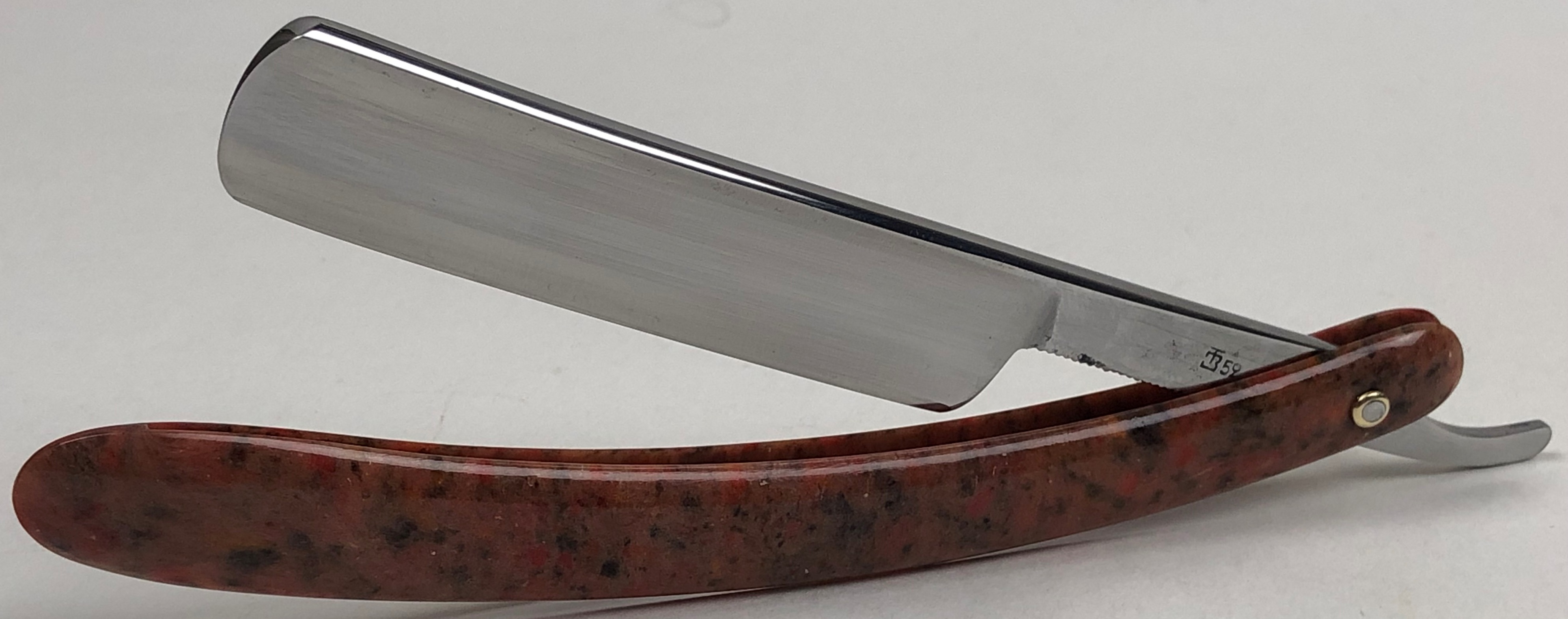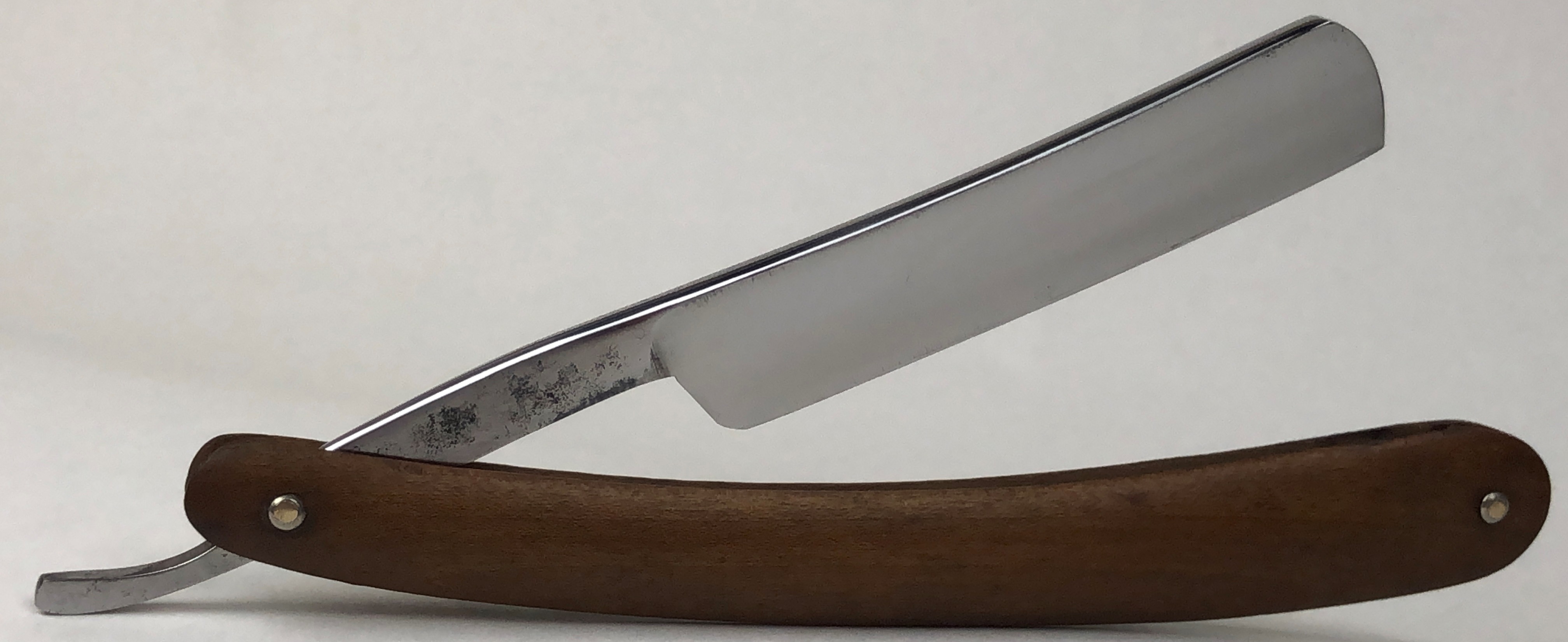 Бритва в очень хорошем состоянии. Немного откорректировал утОчку обушка и умеренно отполировал клинок.Поменял пины на двух-цветные втулки и добавил внутренние шайбы.Идеальная геометрия:кромка ровненькая по всей длине полотна.Тяжёлая.Заточена и готова к бритью.
