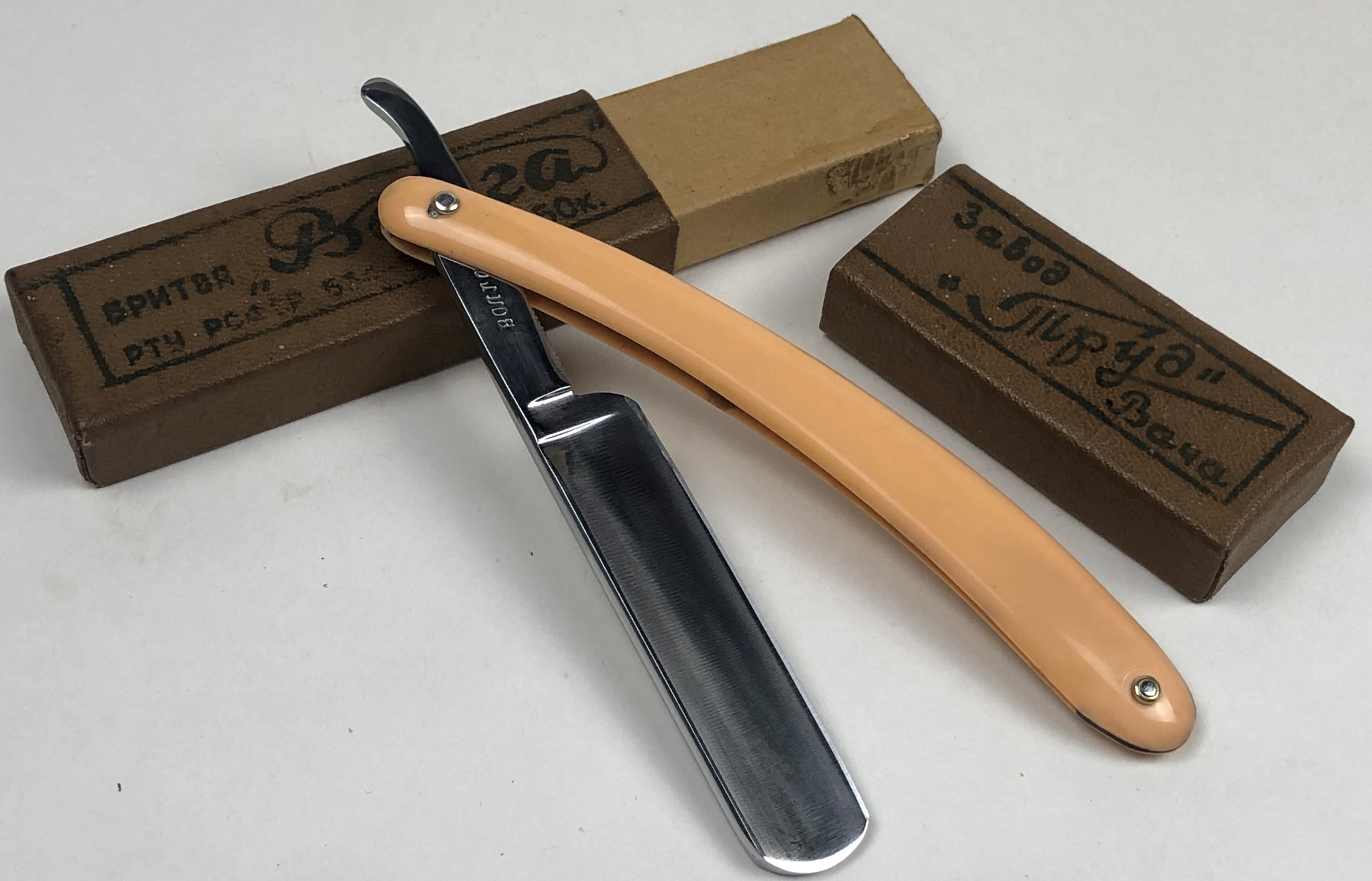 Бритва в очень хорошем и малопользованном состоянии.Немного откорректировал утОчку обушка посередине, которая была получена в результате неправильного выбора метода заточки.Воссоздал типа "заводской" гринд полотна.Кромочка более менее ровненькая. Сталь чистая, без дефектов.Добавил внутренние шайбы и поставил эффектные двух-цветные пины.Оригинальная оправа находитсЯ в идеальном состоянии.Очень неплохая бритовка для начинающих, а также для всех заинтересованных. Заточена и готова к бритью.