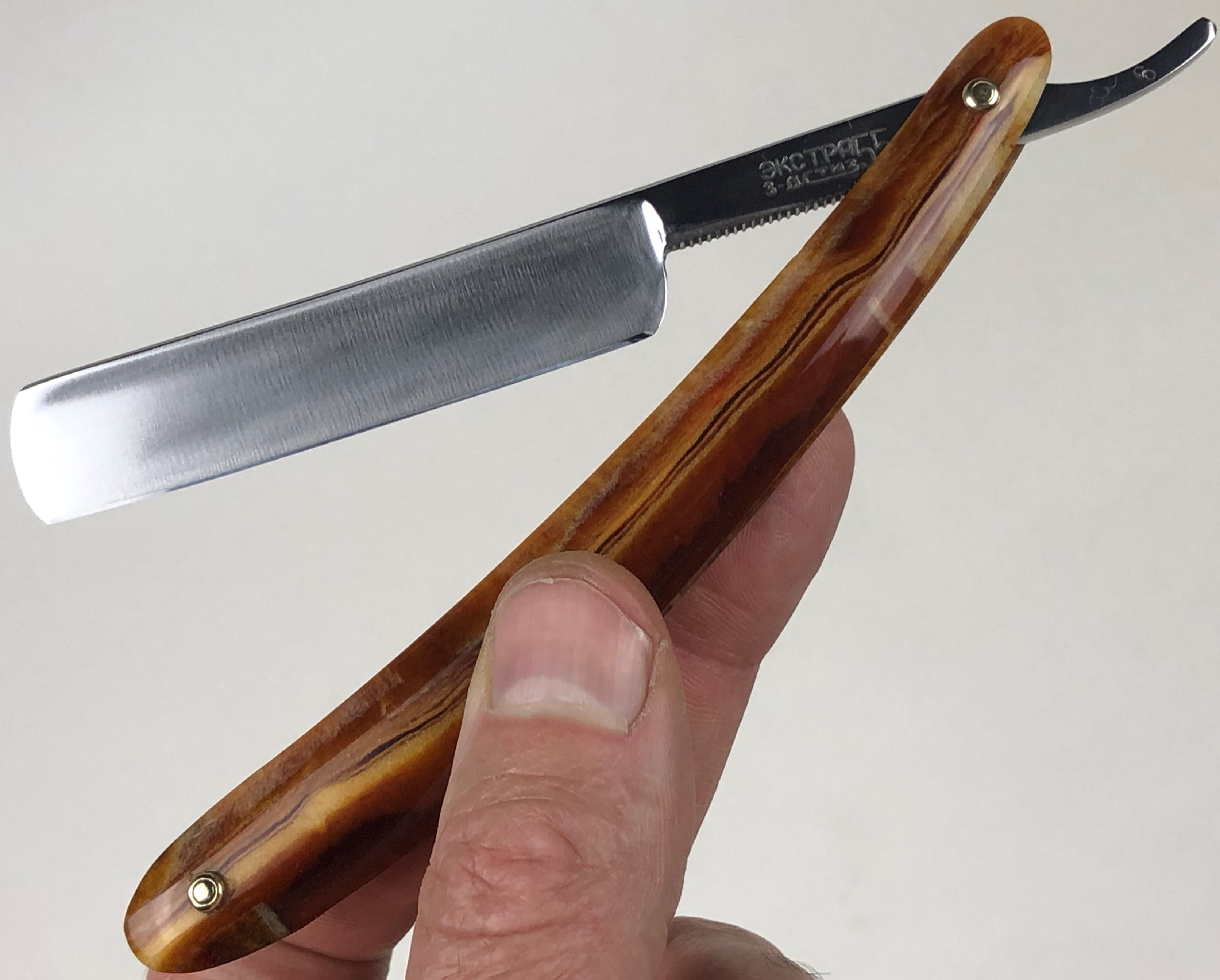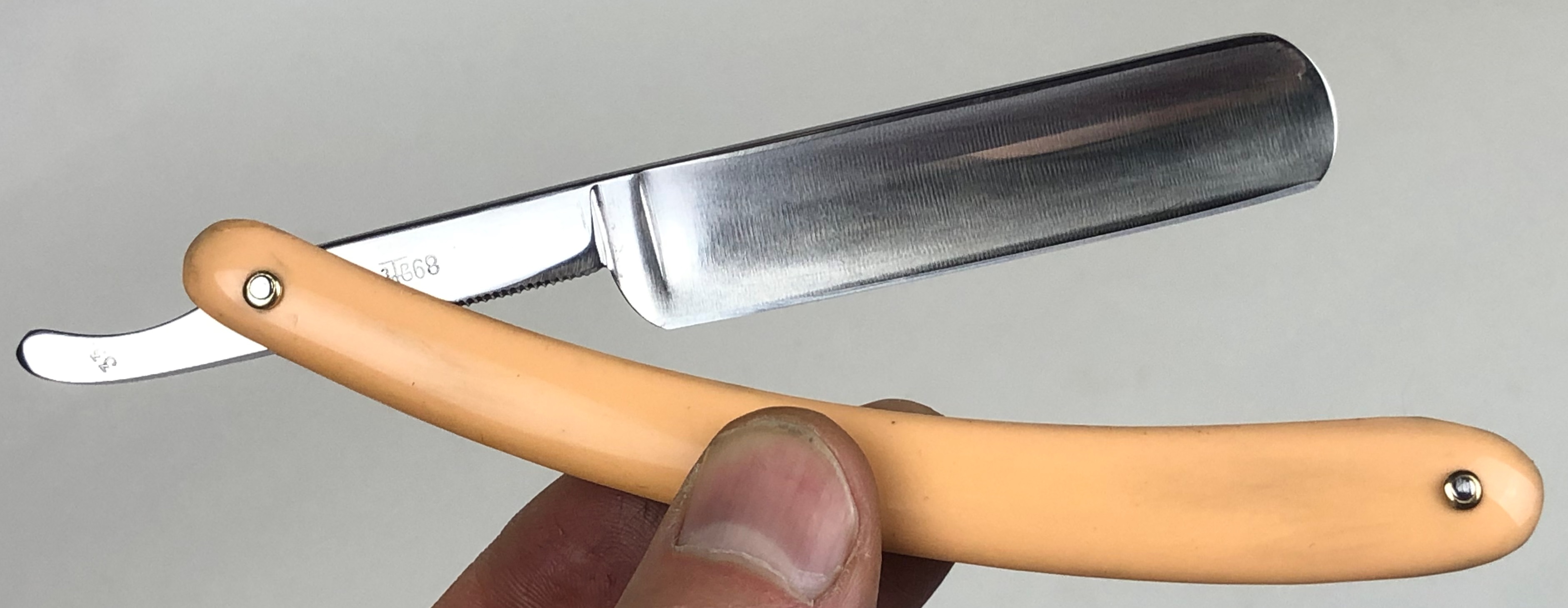 Бритва в очень хорошем состоянии. Немного откорректировал утОчку обушка и умеренно отполировал клинок.Поменял пины на двух-цветные втулки и добавил внутренние шайбы.Идеальная геометрия:кромка ровненькая по всей длине полотна.Тяжёлая.Заточена и готова к бритью.