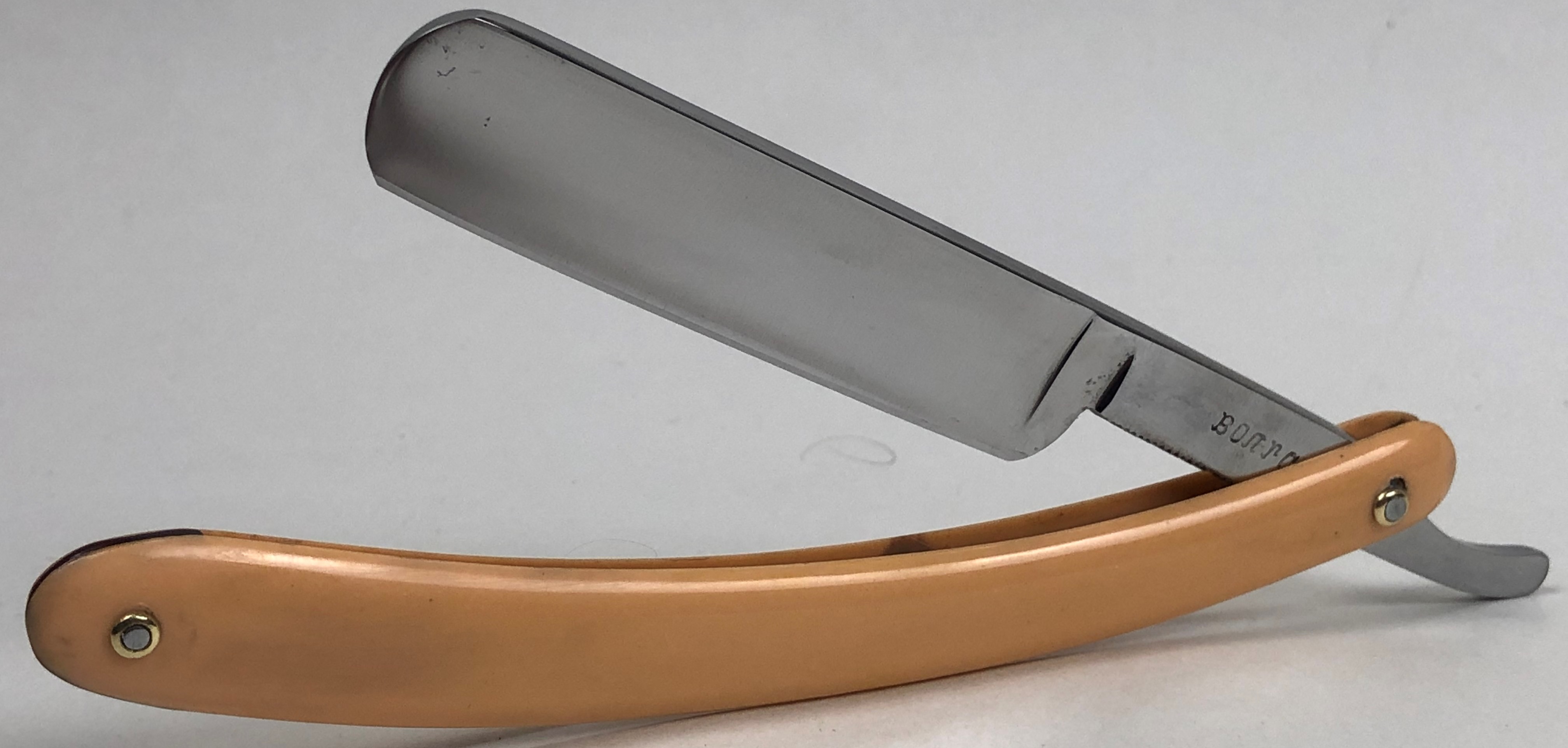 Бритва в очень хорошем и малопользованном состоянии.Немного откорректировал утОчку обушка посередине, которая была получена в результате неправильного выбора метода заточки.Воссоздал типа "заводской" гринд полотна.Кромочка более менее ровненькая. Сталь чистая, без дефектов.Добавил внутренние шайбы и поставил эффектные двух-цветные пины.Оригинальная оправа находитсЯ в идеальном состоянии.Очень неплохая бритовка для начинающих, а также для всех заинтересованных. Заточена и готова к бритью.