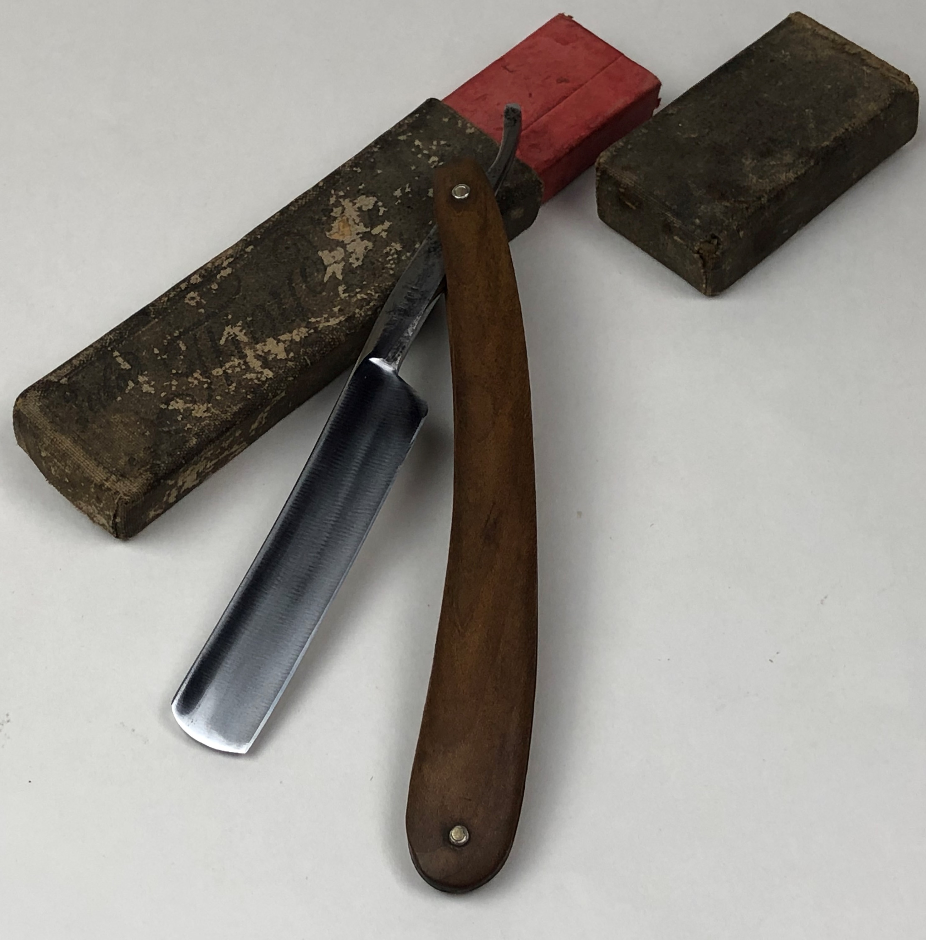 Бритва в прекрасном состоянии, близкое к идеальному, с практически незаметными следами пользования.Заводская шлифовка полотна.Что характерно, обратная сторона полотна бритвы имеет продольную ручную шлифовку, по принципу традиционной японской шлифовки катаны. Бритва была разобрана,для замены пинов и добавления внутренних шайб, для надежности.Со своей стороны умеренно полирнул металл, для придания былого блеска. Идеальная геометрия клинка:кромочка равномерна по всей длине и практически незаметна. Эффектные двух-цветные пины.Красивый и еле заметный элемент налета патины, который хорошо виден на фото, но наяву практически незаметен, но придает бритве естественный вид для своего почтенного возраста.