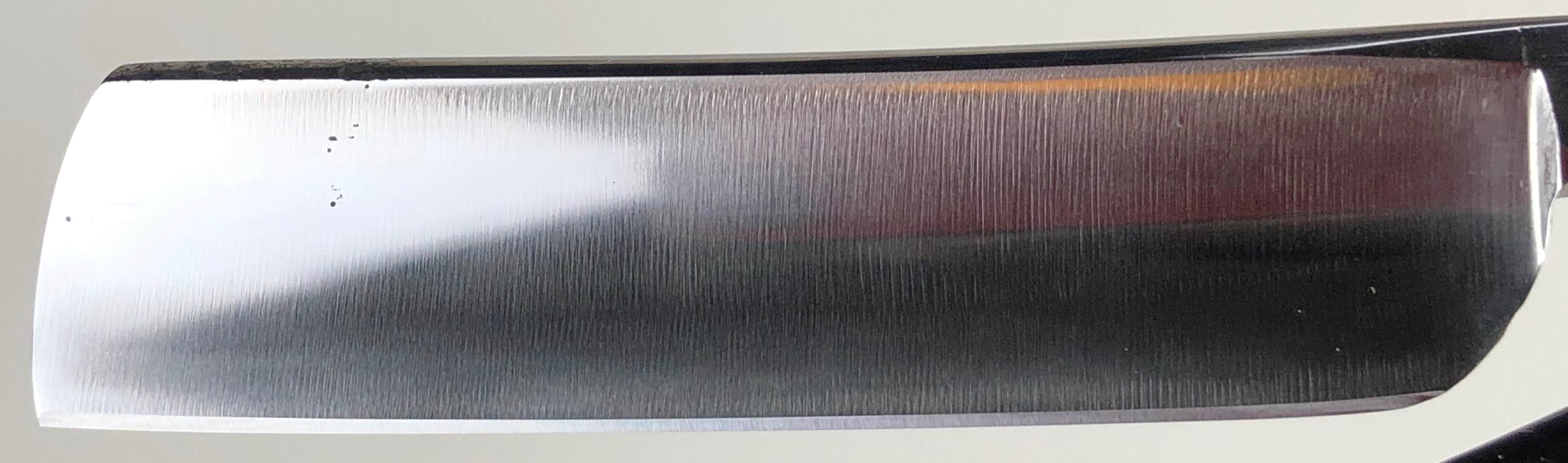 Бритва в прекрасном состоянии, близкое к идеальному, с практически незаметными следами пользования.Заводская шлифовка полотна.Что характерно, обратная сторона полотна бритвы имеет продольную ручную шлифовку, по принципу традиционной японской шлифовки катаны. Бритва была разобрана,для замены пинов и добавления внутренних шайб, для надежности.Со своей стороны умеренно полирнул металл, для придания былого блеска. Идеальная геометрия клинка:кромочка равномерна по всей длине и практически незаметна. Эффектные двух-цветные пины.Красивый и еле заметный элемент налета патины, который хорошо виден на фото, но наяву практически незаметен, но придает бритве естественный вид для своего почтенного возраста.