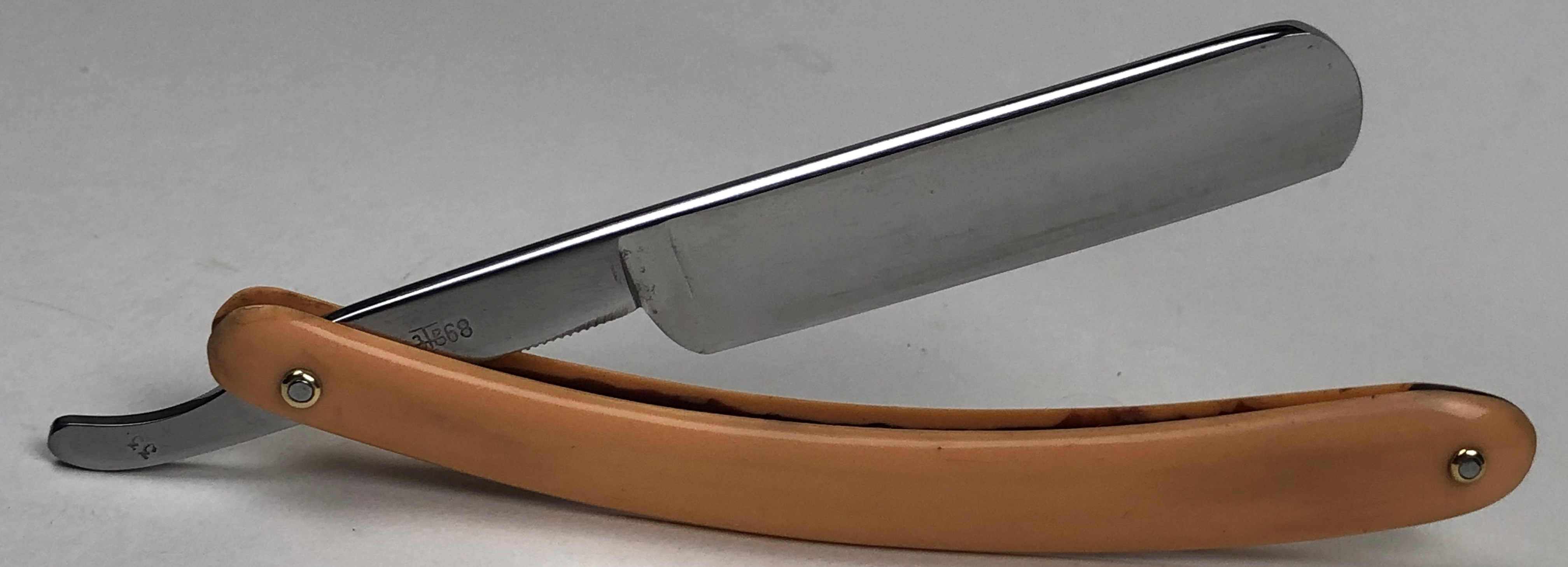 Бритва в очень хорошем и малопользованном состоянии.Немного откорректировал утОчку обушка посередине, которая была получена в результате неправильного выбора метода заточки.Воссоздал типа "заводской" гринд полотна.Кромочка более менее ровненькая. Сталь чистая, без дефектов.Добавил внутренние шайбы и поставил эффектные двух-цветные пины.Оригинальная оправа находитсЯ в идеальном состоянии.Очень неплохая бритовка для начинающих, а также для всех заинтересованных. Заточена и готова к бритью.