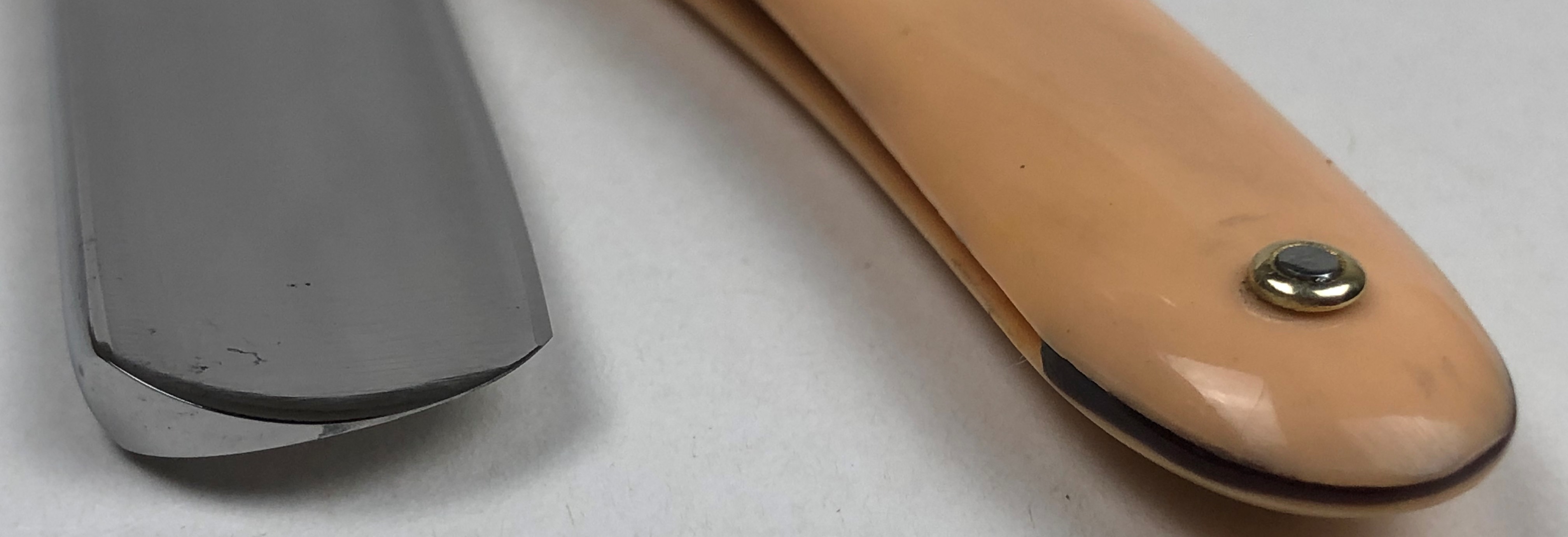 Бритва в прекрасном состоянии, близкое к идеальному, с практически незаметными следами пользования.Заводская шлифовка полотна.Что характерно, обратная сторона полотна бритвы имеет продольную ручную шлифовку, по принципу традиционной японской шлифовки катаны. Бритва была разобрана,для замены пинов и добавления внутренних шайб, для надежности.Со своей стороны умеренно полирнул металл, для придания былого блеска. Идеальная геометрия клинка:кромочка равномерна по всей длине и практически незаметна. Эффектные двух-цветные пины.Красивый и еле заметный элемент налета патины, который хорошо виден на фото, но наяву практически незаметен, но придает бритве естественный вид для своего почтенного возраста.