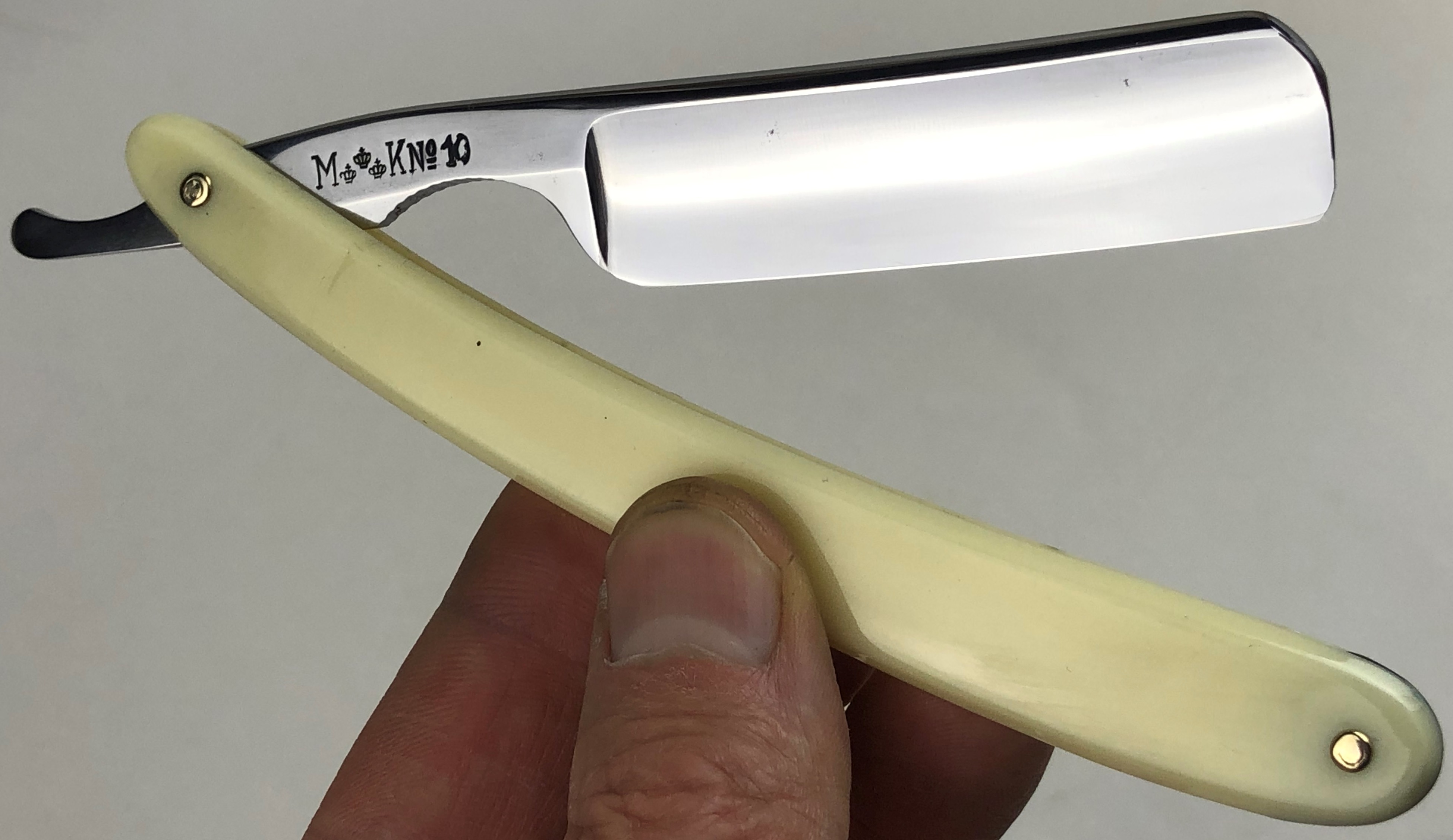 Бритва в очень хорошем состоянии. Немного откорректировал утОчку обушка и умеренно отполировал клинок.Поменял пины на двух-цветные втулки и добавил внутренние шайбы.Идеальная геометрия:кромка ровненькая по всей длине полотна.Тяжёлая.Заточена и готова к бритью.