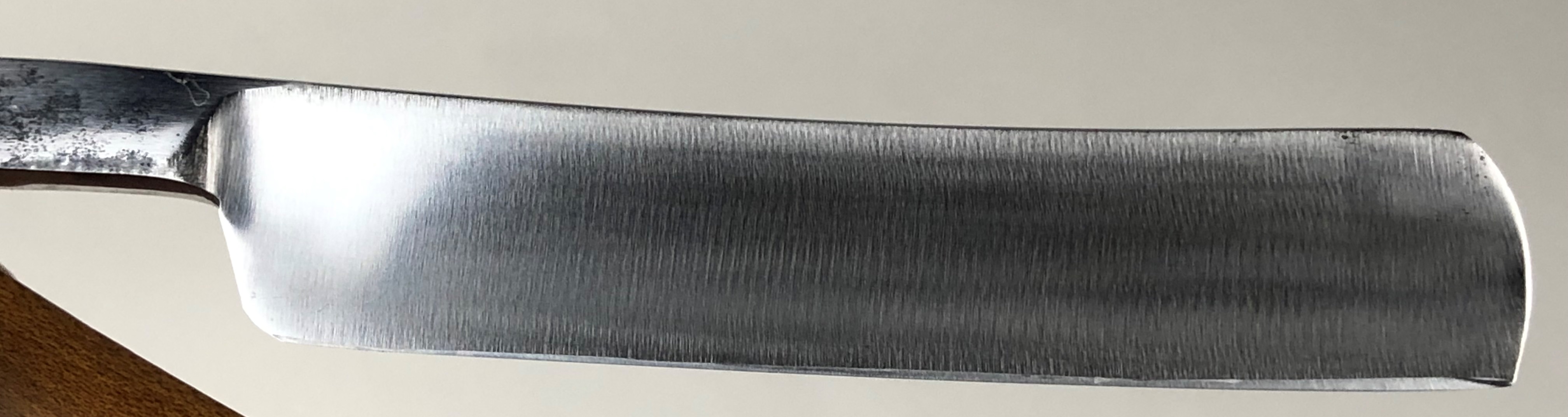Бритва не разбиралась и не ремонтировалась.Без следов пользования. Оригинальная шлифовка. Полирнул немного, для восстановления былого блеска.Сталь чистая, без дефектов. Идеальная геометрия полотна.Заточена и готова к бритью. Совершенно бюджетный вариант для новичка.
