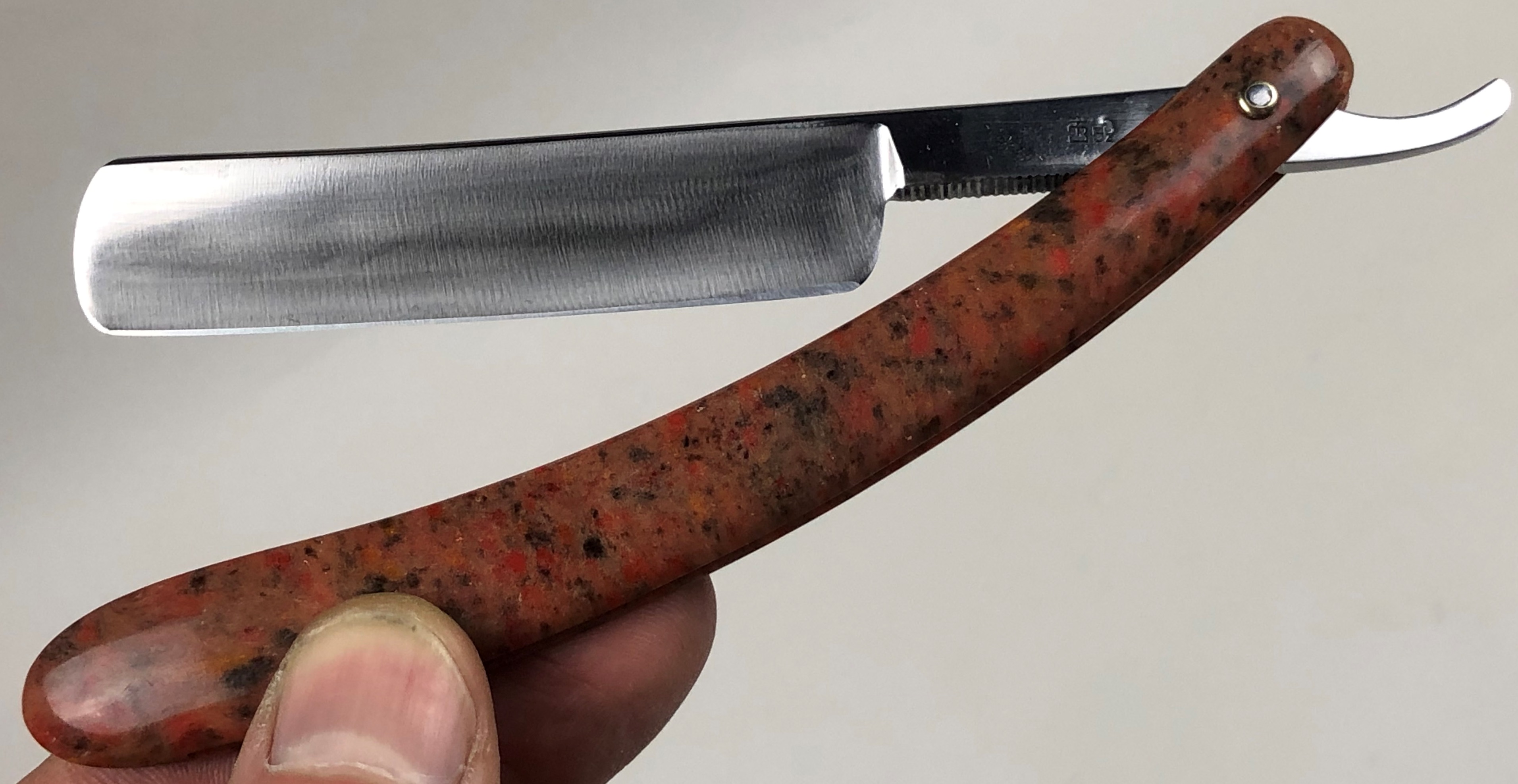Бритва в очень хорошем состоянии. Немного откорректировал утОчку обушка и умеренно отполировал клинок.Поменял пины на двух-цветные втулки и добавил внутренние шайбы.Идеальная геометрия:кромка ровненькая по всей длине полотна.Тяжёлая.Заточена и готова к бритью.