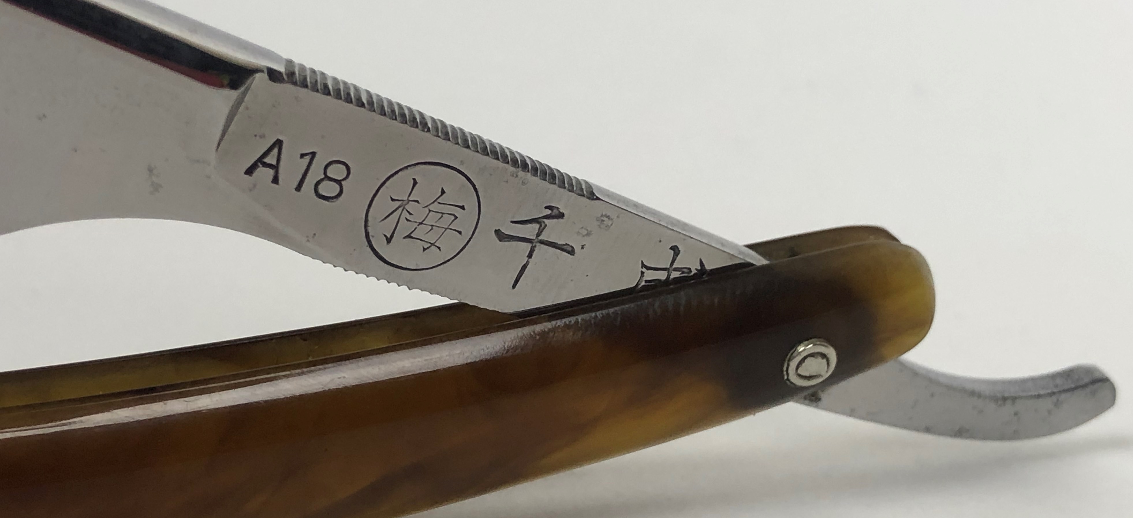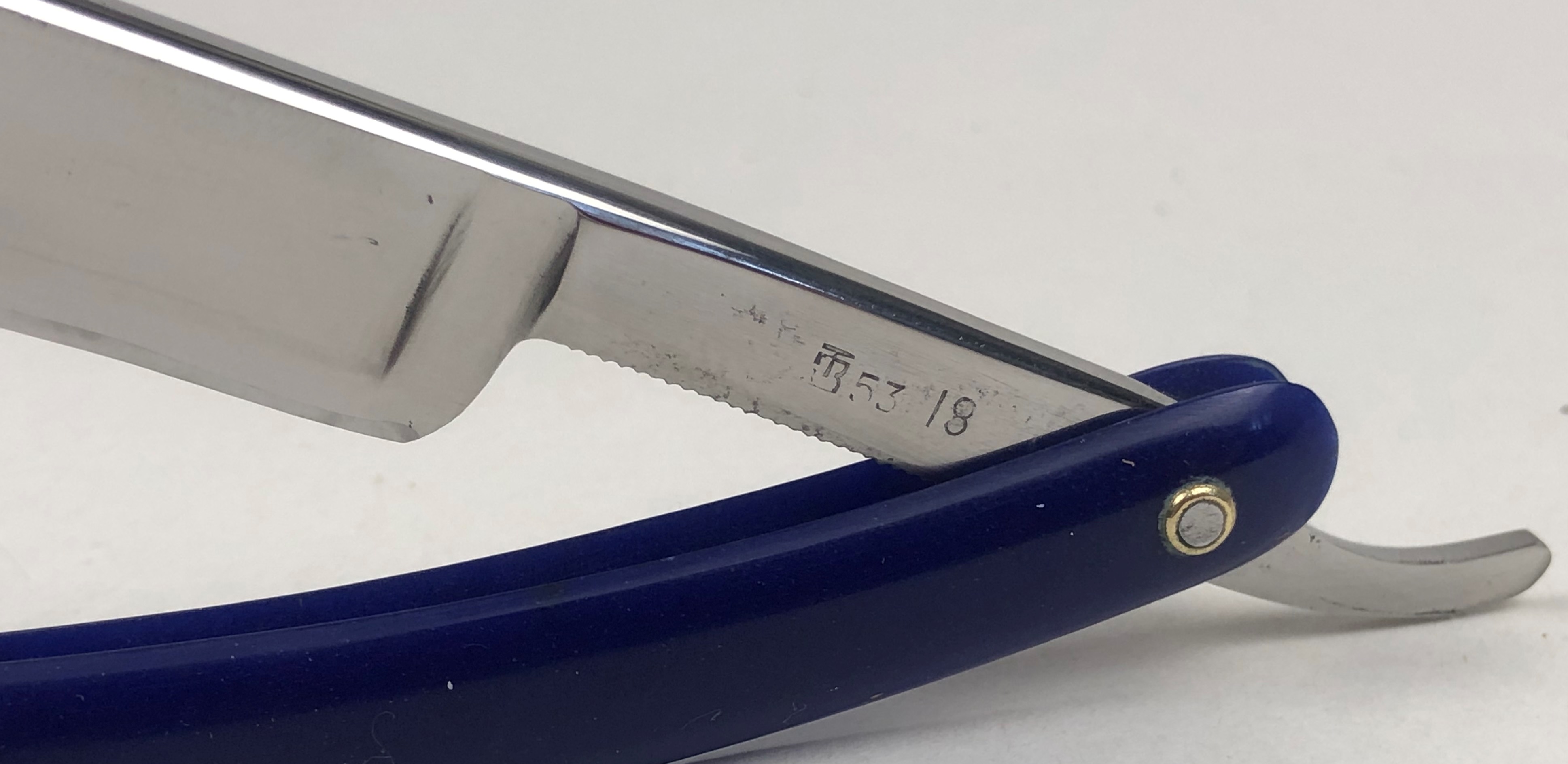 Ширина полотна-23 мм или 7/8. Толщина обушка-6.5 мм. Длина РК-50 мм. Полная вогнутость. Углеродистая сталь. Примерно 50-60-е годы прошлого века. Бритва в прекрасном непользованном состоянии. Заводская шлифовка и полировка полотна.Была разобрана, чтобы немного почистить район осевого пина и добавить внутренние шайбы. Фирменная "ступенька" полотна также присутствует. Идеальная геометрия клинка:кромочка равномерна по всей длине. Прекрасный и достаточно редкий экземпляр с таком состоянии. Заточена и готова к бритью. Цена-20500 р с доставкой.ПРОДАН Spoiler Show