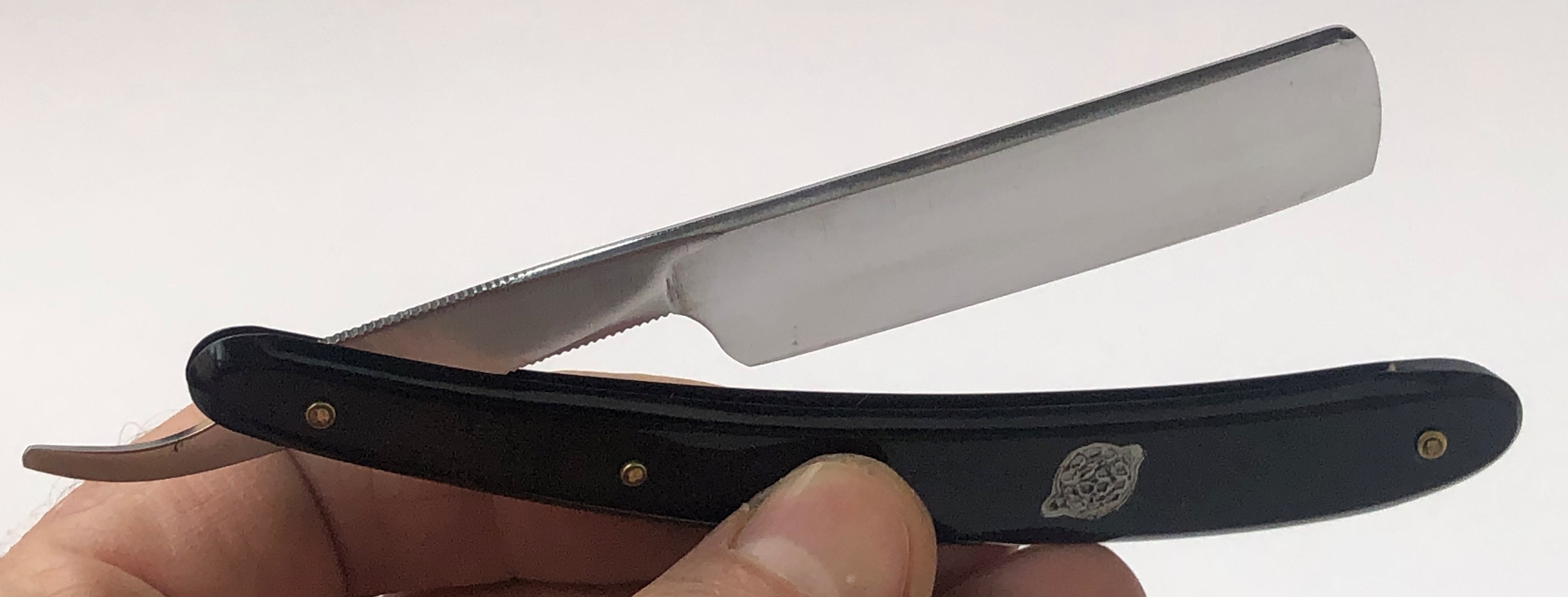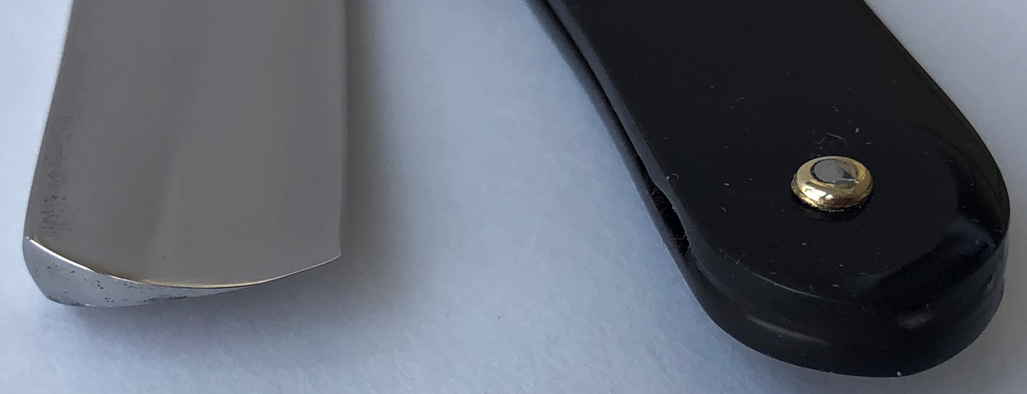 Бритва в пользовании не была.Но пришлось разобрать,чтобы почистить в районе осевого пина. Заодно самую малость освежил само полотно от патины и попробовал повторить "заводской" гринд.Дополнительно поставил внутренние шайбы и поменял оригинальные заклепки на двух-цветные пины.Бритва с виду имеет состояние новой. Идеальная геометрия полотна:кромочка равномерна по всей длине.Качественная сталь способна выдавать чистое и мягкое бритье. Также отличный вариант для новичка. Заточена и готова к бритью.