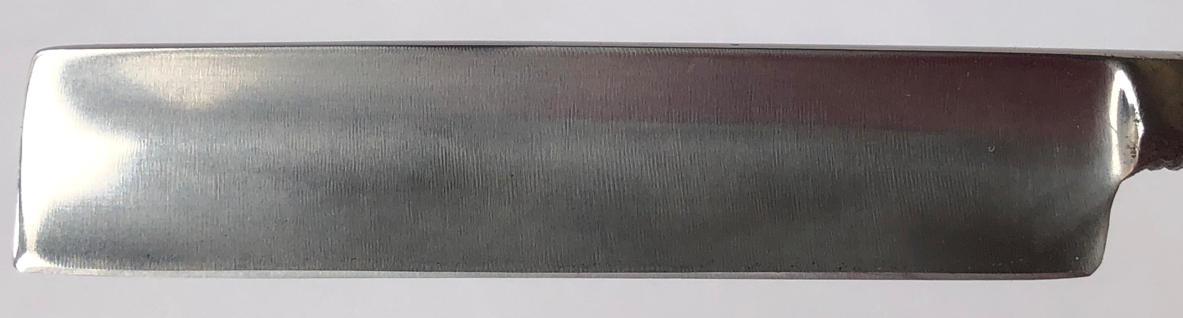 Бритва не разбиралась и не ремонтировалась. Все в оригинале. Заводская заточка была переделана под нормальное бритье.За исключением небольшого и малозначительного окисления с одной стороны полотно, все чисто, без дефектов. Геометрия приближена к идеальной.