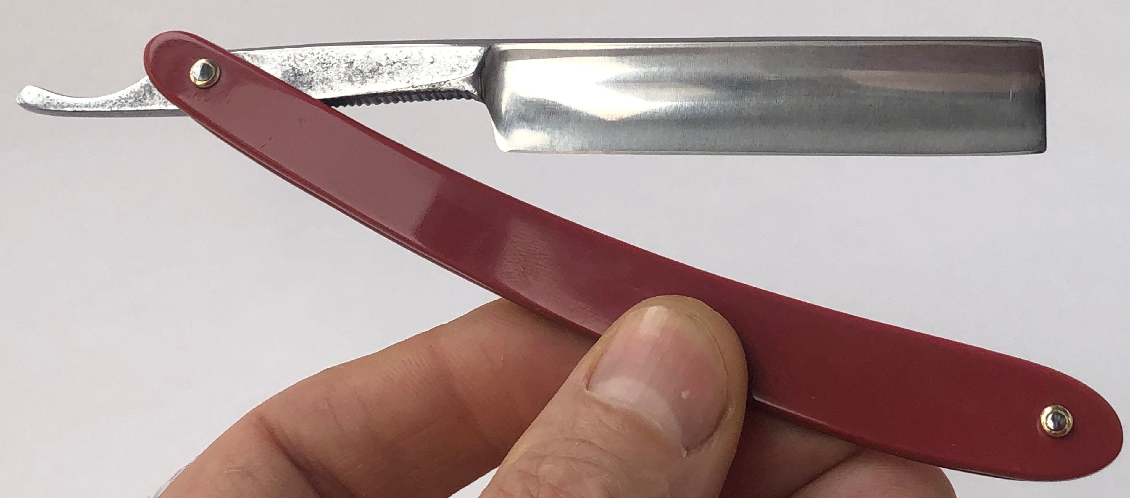 Бритва в пользовании не была.Но пришлось разобрать,чтобы почистить в районе осевого пина. Заодно самую малость освежил само полотно от патины и попробовал повторить "заводской" гринд.Дополнительно поставил внутренние шайбы и поменял оригинальные заклепки на двух-цветные пины.Бритва с виду имеет состояние новой. Идеальная геометрия полотна:кромочка равномерна по всей длине.Качественная сталь способна выдавать чистое и мягкое бритье. Также отличный вариант для новичка. Заточена и готова к бритью.