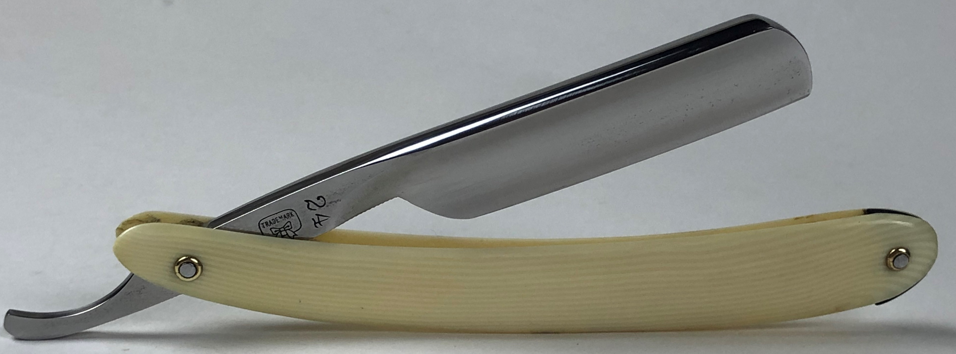 Цифра 24 означает форму лезвия бритвы, с углом атаки 24 градуса, что дает возможность бриться (за счет толстенного обушка) плашмя, не выставляя угол бритья.Очень удобно не только брить барберу, но также учиться бриться новичку. Бритва укороченная, среднего размера, способная выбривать труднодоступные места, а также пойдет для коррекции усов и бороды.Короче, на все случаи жизни. А отличная углеродистая сталь способна выдавать чистое и мягкое бритье.
