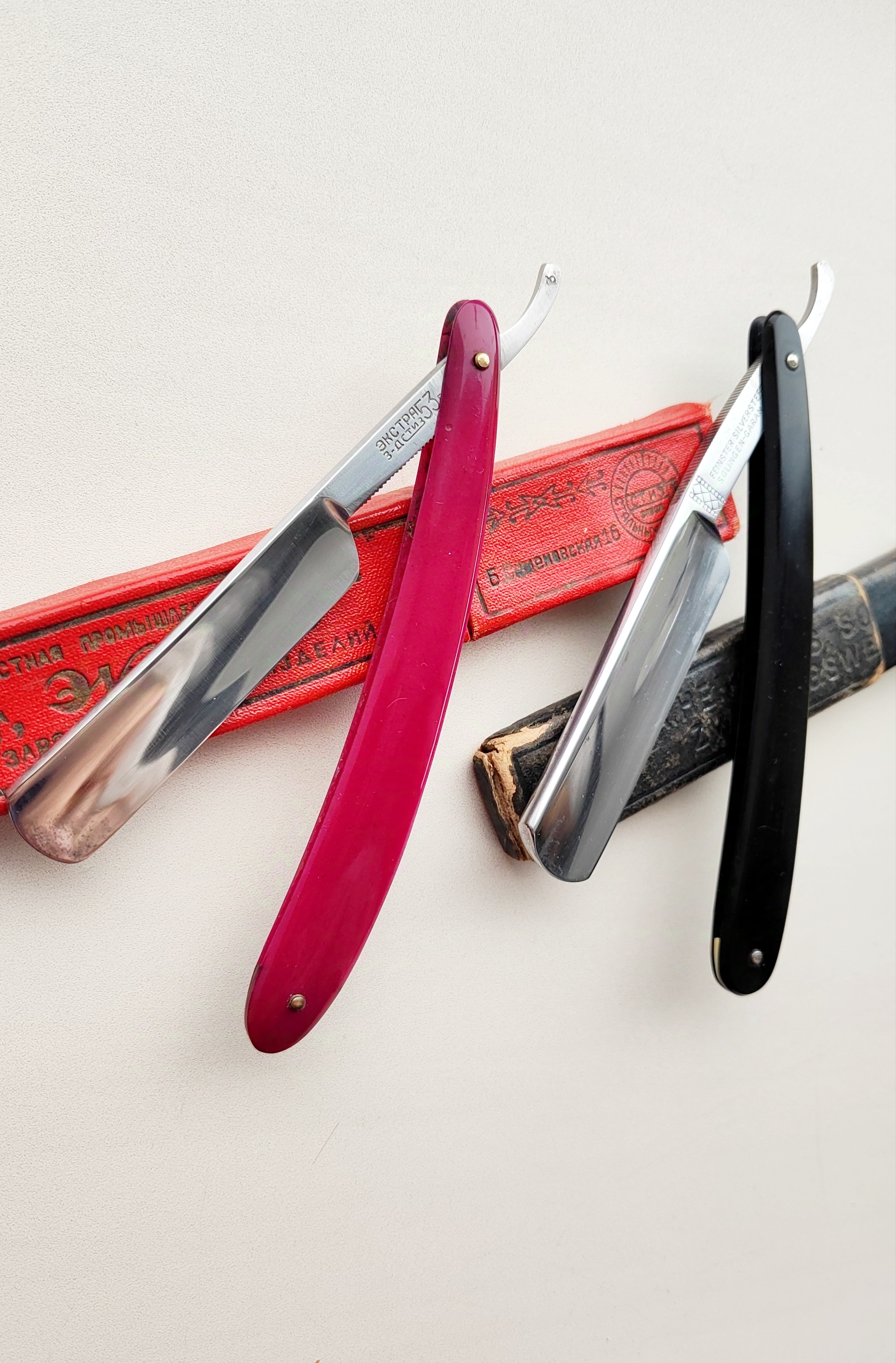 Попалась мне тут пара бритв, владелец у них когда то был один, родственники нашли их в закромах и они теперь мои. Одна Сталина помнит, вторая - некоего Г. И ведь уживались вместе. Немец - бест сильвер стил, ещё и ручку от СТИЗ ей приладили, футляр от Хенкельс. Скорее всего изначально ручка была из целюлоида, этот материал плохо переносит возраст, поменяли и сохранили родной пин. СТИЗ Экстра 53 - ширина 17 мм Feinster SilverSteel Solingen - ширина 20 мм.