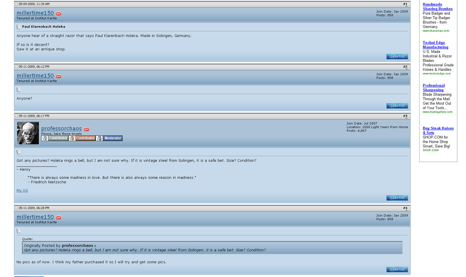 В общем перевернул все книги, облазил интернет, нашёл только производителя. ТМ HOLEKA принадлежала Paul Klarenbach. Фото надо бы в галерею, но тему жаль... Ремонт опасных бритв, звонить с 11-00 до 23-00, +79267729357, (viber, whats app, telegram, VK), спросить Олега.