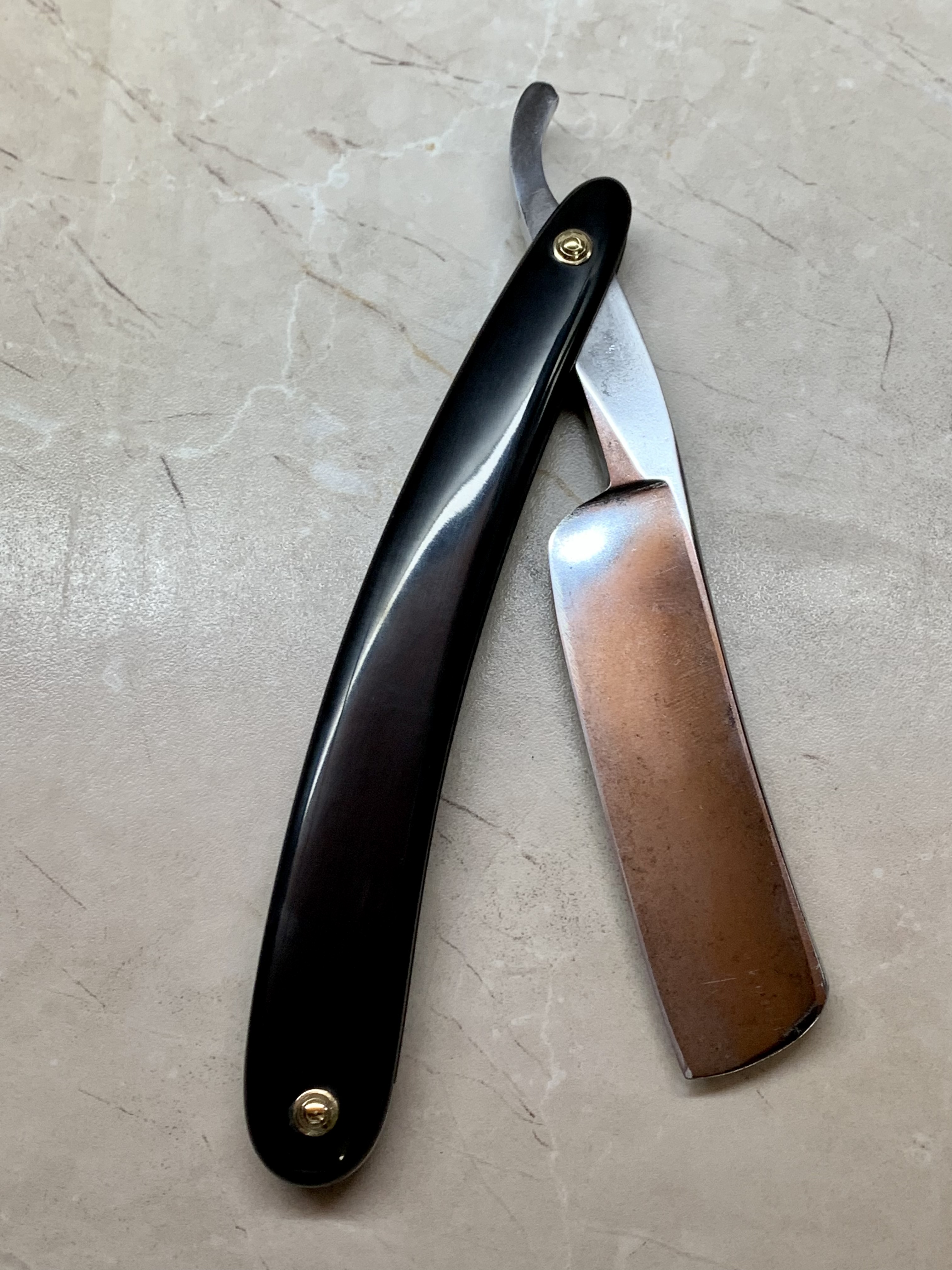 Датировать бритовку не могу, такая же Leresche et Cie проскакивала здесь в продажах у Boris (viewtopic.php?f=7&t=4441&p=85478&hilit=leresche#p85478). На хвостике выбиты цифры 60-4; может год выпуска, может модель... Досталась в жутком ржавом состоянии, но благодаря выборке в четверть, "мяса" для регринда осталось достаточно, да и коррозия на РК не выходит.