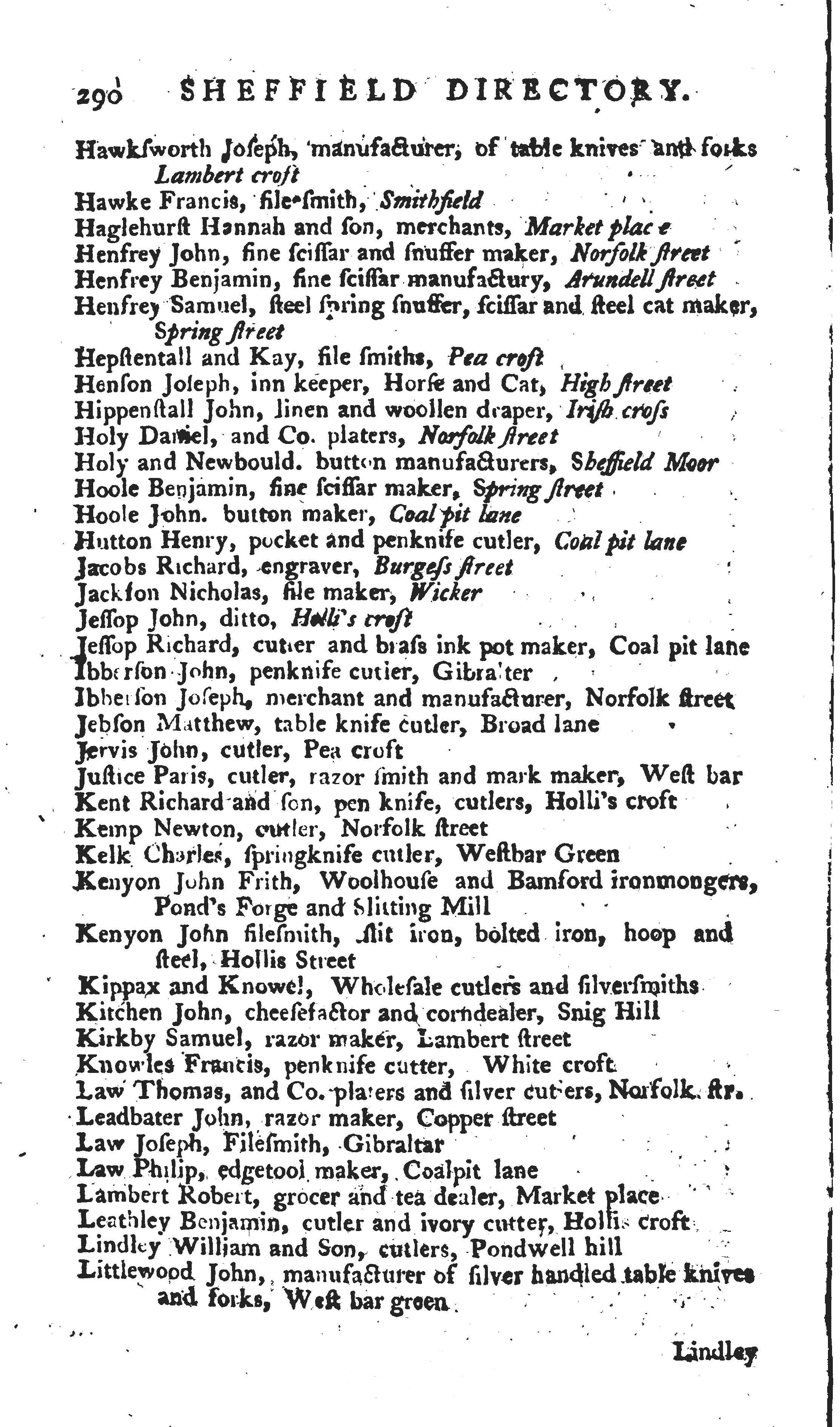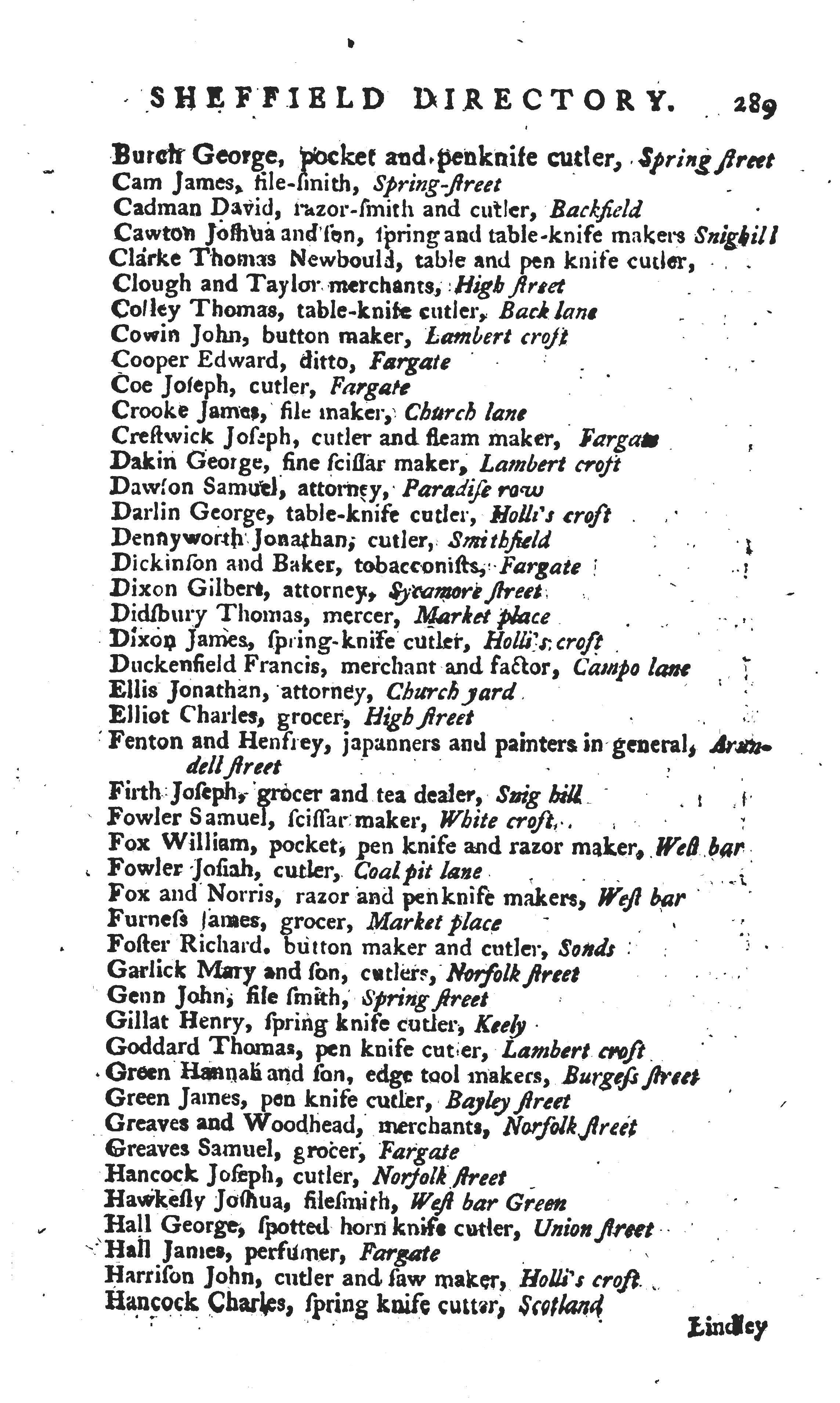 1787, Гейлз и Мартин, Справочник Шеффилда, включая производителей соседних деревень. Очень старые английские бритвы (до 1810 года).1797, John Robinson, A Directory of Sheffield, Including the Manufacturers of the adjacent Villages.