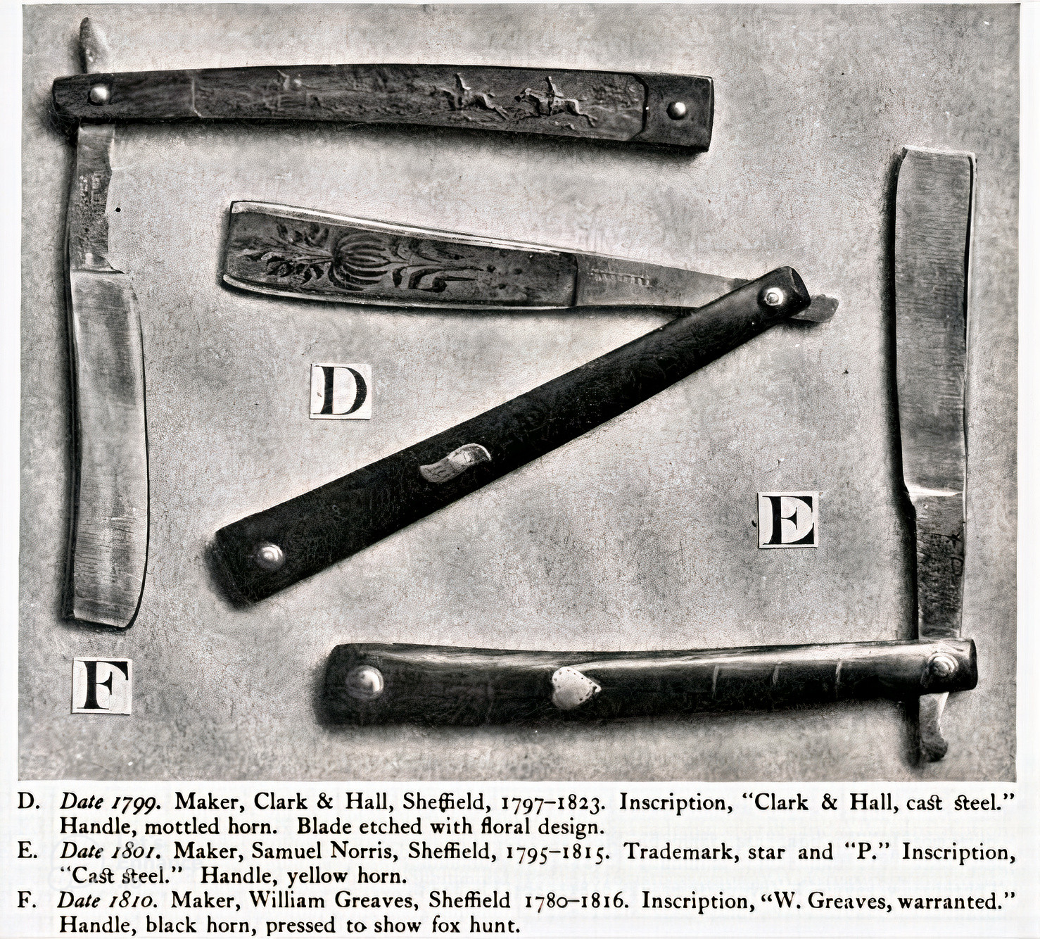 Торговая марка, крест и надпись "Smith". Ручка: черный рог, металлический наконечник. B. Дата 1780 год. Производитель, John Shepherd, Шеффилд, 1770-1795 годы. Торговая марка, корона и надпись "Wolf". Присутствует надпись "Acier fondu". Ручка: кость. C. Дата 1790. Производитель, Staniforth, Parkin & Co., Шеффилд, 1785-1800. Торговая марка "Parkin". Надпись "Acier fondu". Ручка: пестрый рог. D. Дата 1799. Производитель Clark & Hal, Шеффилд, 1797-1823. Надпись "Clark & Hall, cast steel" Ручка: пятнистый рог. Клинок травлен цветочным узором. E. Дата 1801. Производитель Samuel Norris, Шеффилд, 1795-1815. Торговая марка, звезда и "P". Надпись,"cast steel". Ручка, желтый рог. F. Дата 1810. Производитель William Greaves, Шеффилд 1780-1816. Надпись "W. Greaves, warranted". Ручка, черный рог, выдавлен сюжет - охота на лис. Еще одна статья "More Old Razors", "Больше старых бритв" Генри Т. Ламмуса была опубликована в 1927 году, в том же журнале ANTIQUES, в ней также были бритвы 18 века: 1. Дата 1770 г. Производитель неизвестен, но несомненно, Шеффилд, Англия. Торговая марка: трубка и буква N или Z. Рукоять: кость. Трубка в различных комбинациях использовалась в качестве товарного знака многими катлерами Шеффилда. 2. Дата 1775. Производитель John Brammal или Bramhall, местечко Storrs, близ Шеффилда (1770-1800). Торговая марка: Joppa. Надпись: "Bramall". Ручка: черный рог 3. Дата 1780 г. Производитель ohn Shepherd, Шеффилд (1770-1795). торговая марка: корона и волк. Рукоять: панцирь черепахи, металлические наконечники. 4. Дата 1785. Производитель Brittain, Wilkinson & Brownell, Шеффилд (1780-1840). Торговая марка: "France". Рукоять: красный рог. 5. Дата 1785. Производитель Thomas Warburton, Шеффилд (1770-1835). торговая марка: "Lisbon". Рукоять: черный рог, металлические наконечники. Очень старые английские бритвы (до 1810 года)."STANDARD GUIDE TO RAZORS, identification and values", third edition, Roy Ritchie and Ron Stewart. "СТАНДАРТНОЕ РУКОВОДСТВО ПО БРИТВАМ идентификация и ценности», третье издание, авторы Рой Ричи и Рон Стюарт: