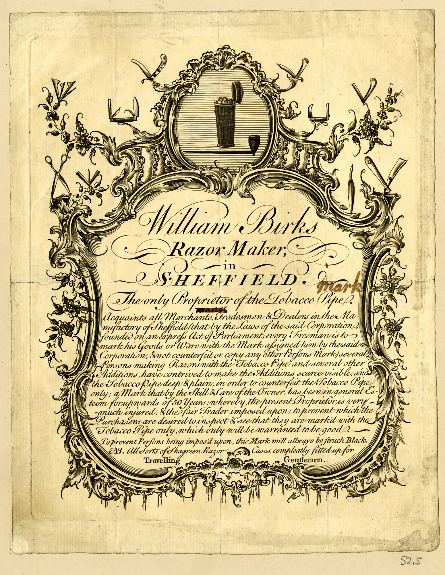 1797, Джон Робинсон, Справочник Шеффилда, включая производителей соседних деревень. Очень старые английские бритвы (до 1810 года).В статье 1922 года "Old Sheffield Razor", "Старые Шеффилдские Бритвы" опубликованной в декабрьском номере журнала ANTIQUES, Генри Т. Ламмус показывает некоторые экземпляры 18 века: