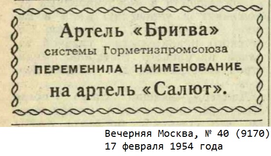 А это и есть артель Бритва, которая переименовалась в 1954м.