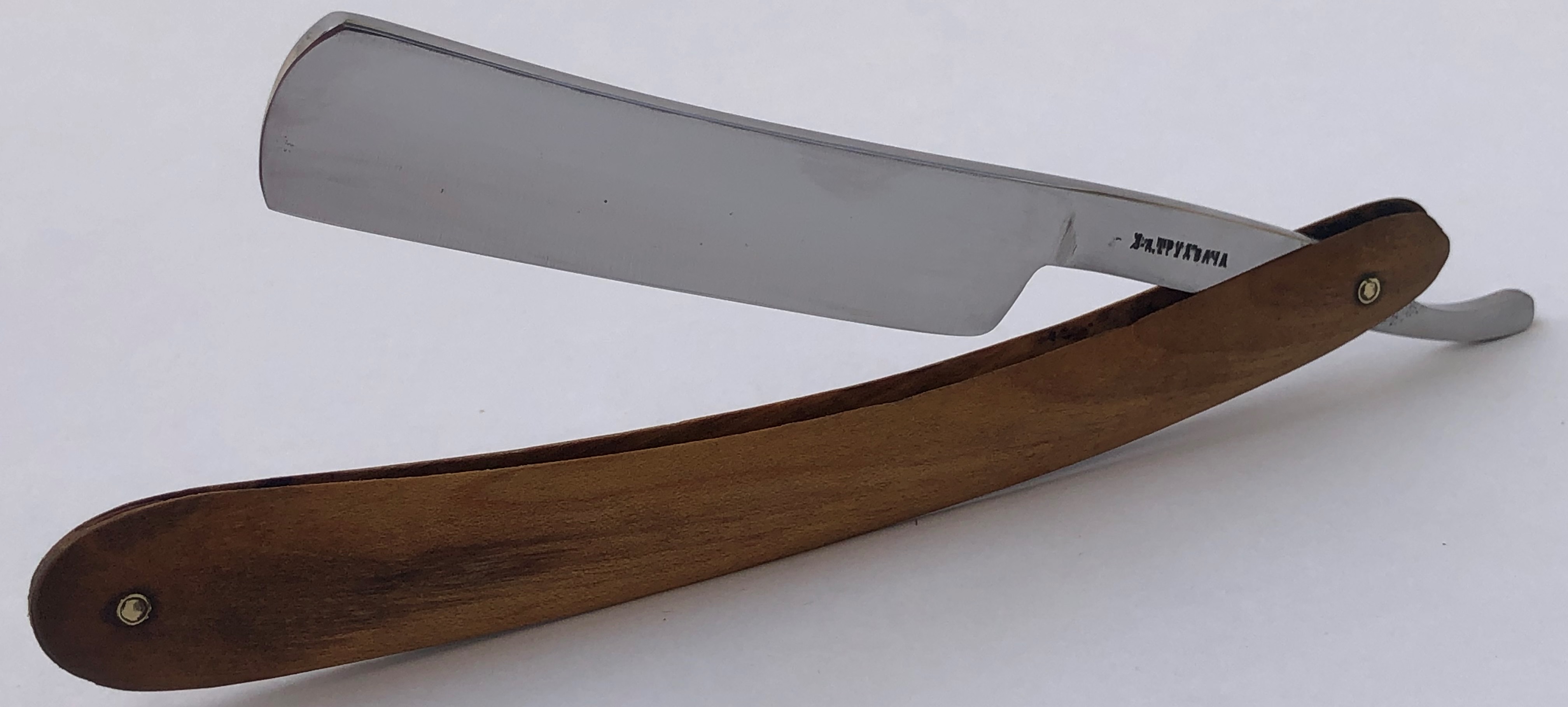Бритва без следов пользования. Не разбиралась.А районе осевого пина не чистилась и не полировалась. Само полотно аккуратно ,косметически, на самых тонких абразивах очистил от патины и умеренно отполировал.Идеальная геометрия клинка:кромочка равномерна по всей длине и еле заметна. Деревянная ручка также в идеальном состоянии.Родная и не менее редкая коробочка в наличии!Бритва заточена и лично протестирована. Все на очень приличном уровне.