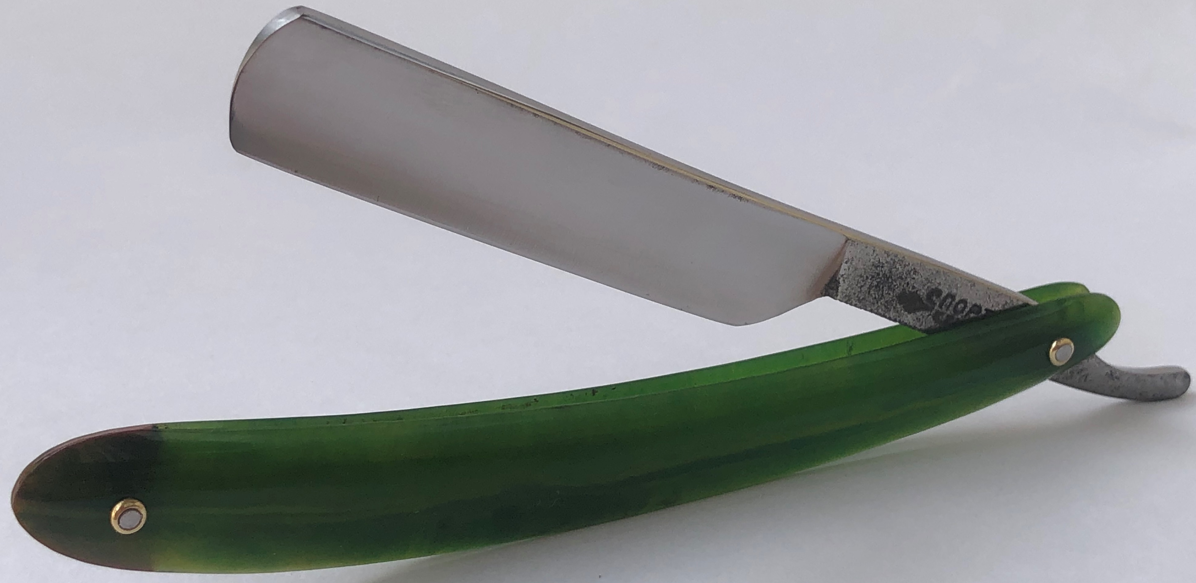 Бритва в идеальном и непользованном состоянии. Была разобрана для удаления окисления в районе осевого пина, а также немного освежил само полотно от небольшого налёта патины.Косметическая, минимальная шлифовка и умеренная полировка.Идеальная геометрия клинка:кромочка равномерна по всей длине.Отличная "звонкая" сталь.Мощная и надёжная трёх-пиновая оправа.Состояние новой. Бритва заточена и готова к бритью.