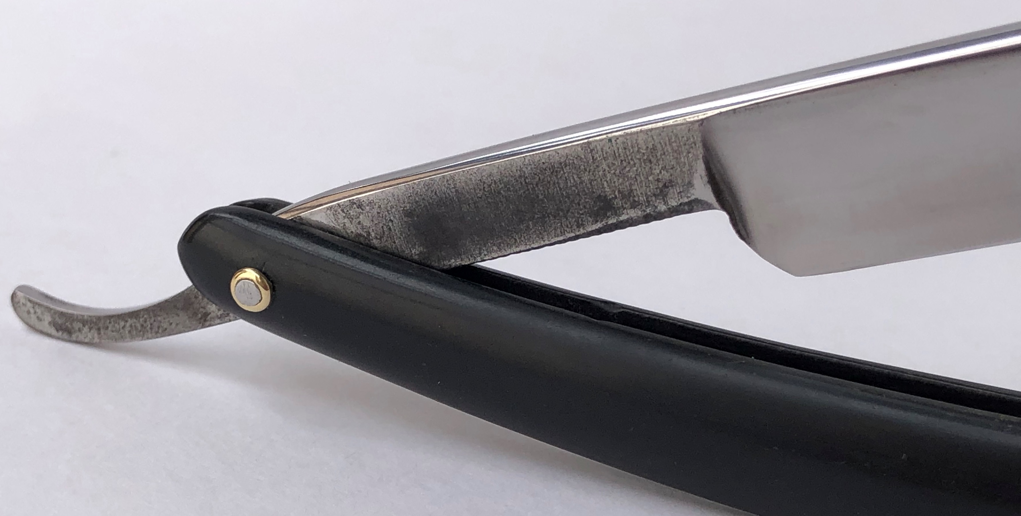 Клинок не ремонтировался.Оригинальная шлифовка и полировка.Ничего тут не делалось. Бритву разобрал для заметны пинов, так как родной осевой был неудачно поставлен, в связи с чем клинок закрывался криво.Еле заметные элементы патины не стал убирать, чтобы сохранить заводскую оригинальность клинка.Видимых дефектов не обнаружено.Бритва хоть и среднего размера, но достаточно тяжёлая, из за своей формы лезвия.Идеальная геометрия полотна:кромочка равномерна по всей длине и еле заметна.Заточена и готова к бритью.