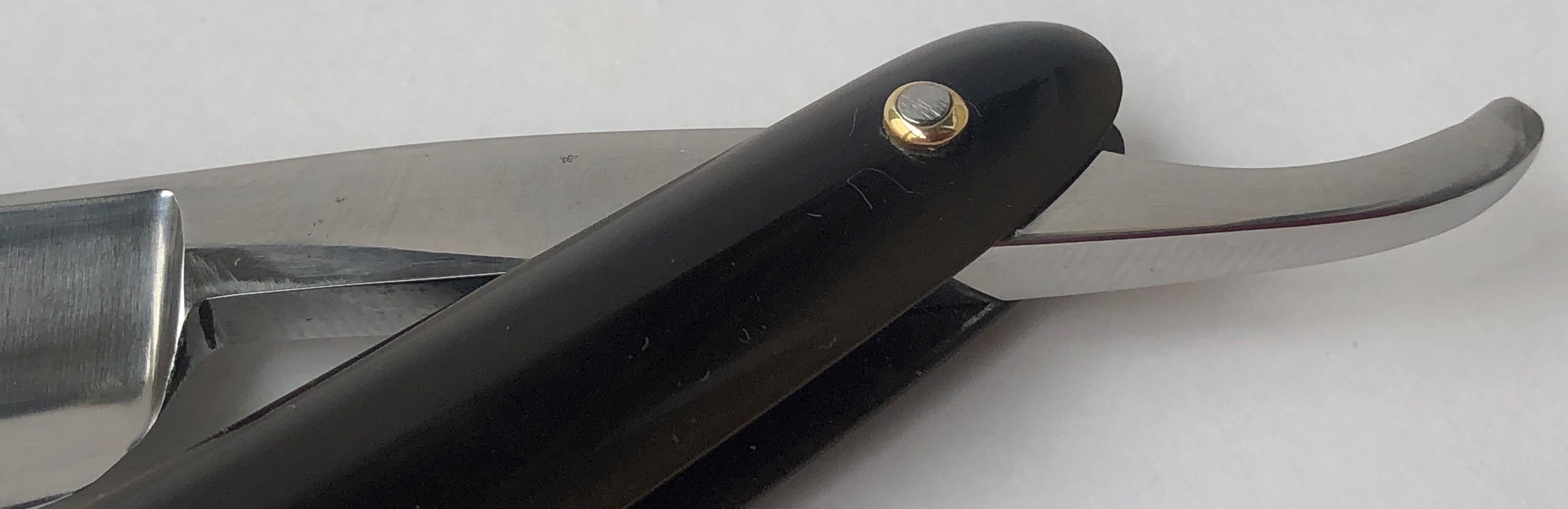 Убрал старинную патину, царапины и умеренно отполировал.Родной осевой пин был аккуратно заново установлен.Бритва в состоянии новой.Идеальная геометрия клинка:кромочка равномерна по всей длине.Бритва удобна во всех отношениях, хоть для новичка, хоть для опытного пользователя.Дорогой родной бакелитовый кейс в комплекте! Бритва заточена и готова к бритью.