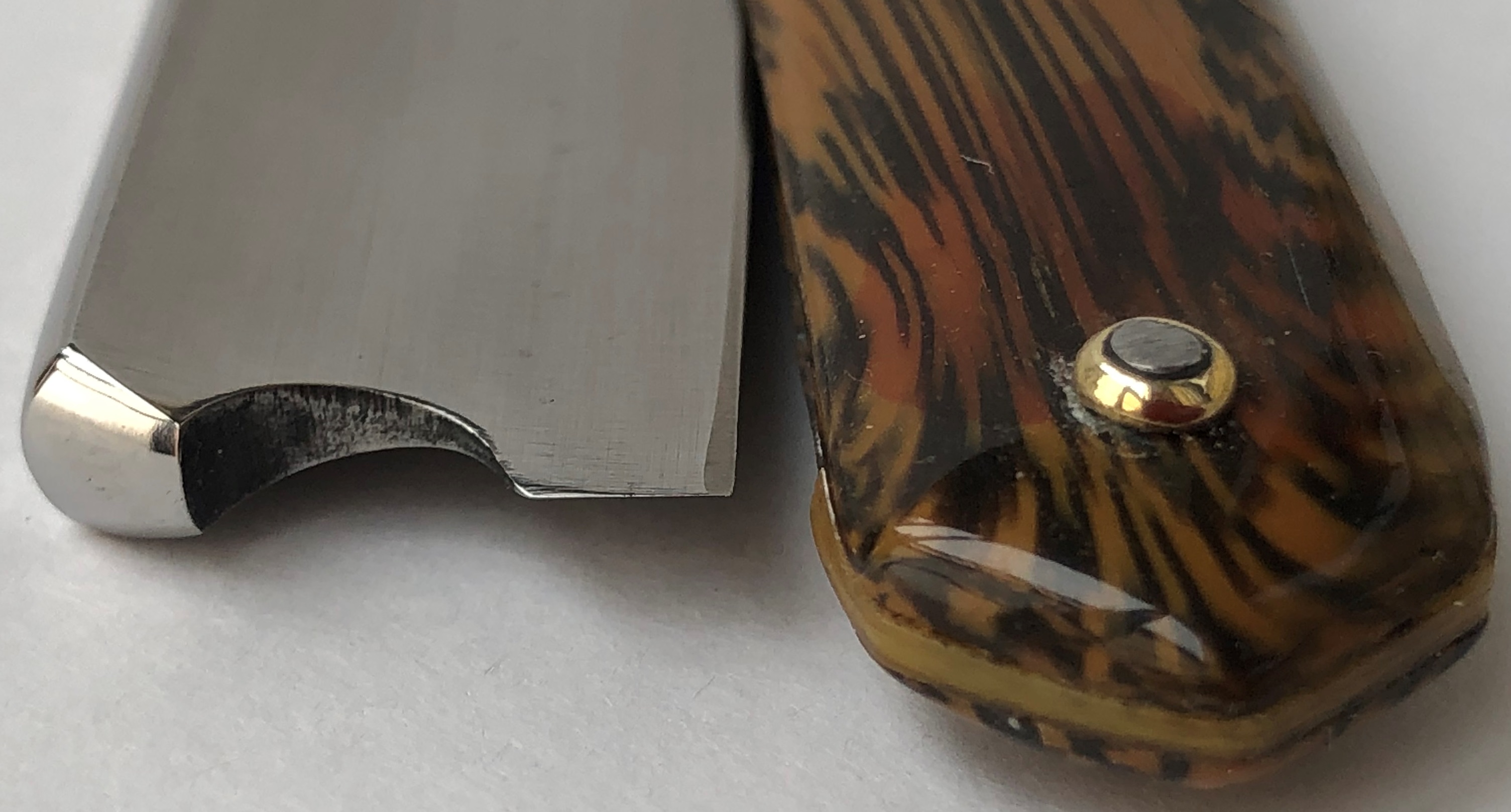 Клинок не ремонтировался.Оригинальная шлифовка и полировка.Ничего тут не делалось. Бритву разобрал для заметны пинов, так как родной осевой был неудачно поставлен, в связи с чем клинок закрывался криво.Еле заметные элементы патины не стал убирать, чтобы сохранить заводскую оригинальность клинка.Видимых дефектов не обнаружено.Бритва хоть и среднего размера, но достаточно тяжёлая, из за своей формы лезвия.Идеальная геометрия полотна:кромочка равномерна по всей длине и еле заметна.Заточена и готова к бритью.