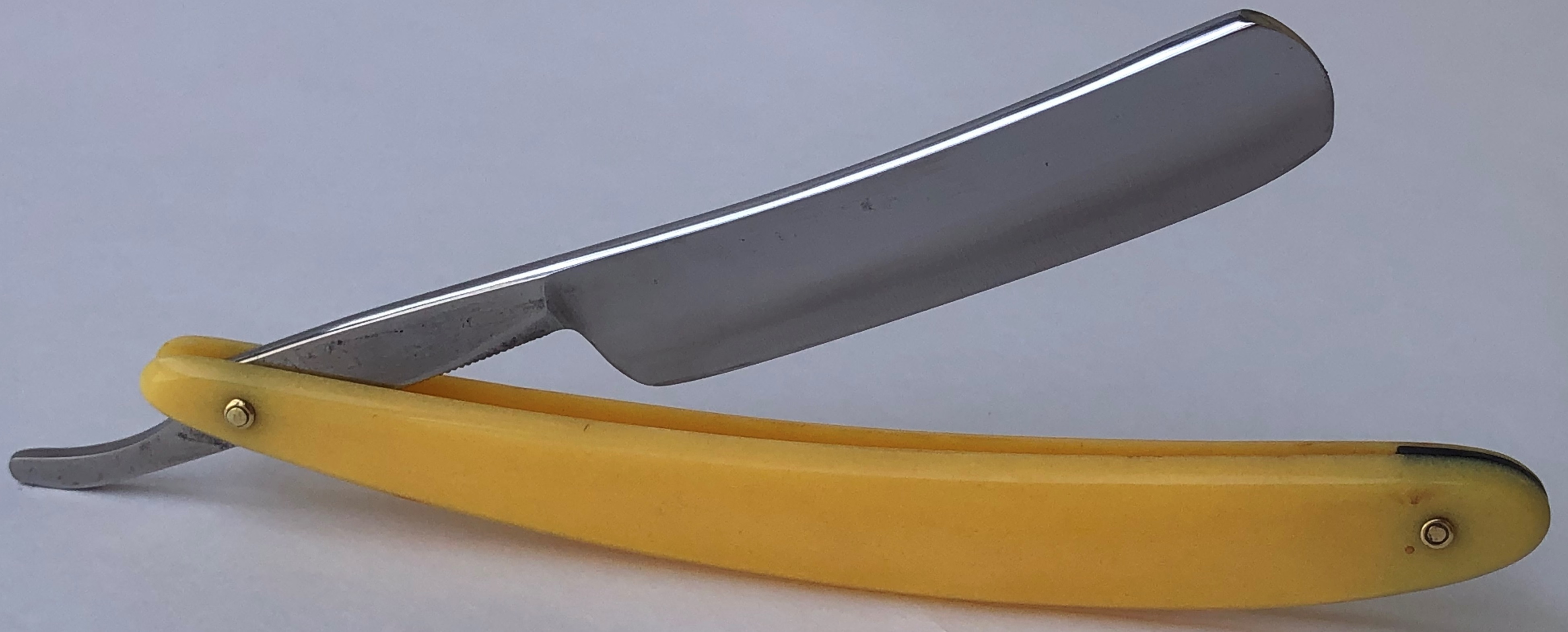 Убрал старинную патину, царапины и умеренно отполировал.Родной осевой пин был аккуратно заново установлен.Бритва в состоянии новой.Идеальная геометрия клинка:кромочка равномерна по всей длине.Бритва удобна во всех отношениях, хоть для новичка, хоть для опытного пользователя.Дорогой родной бакелитовый кейс в комплекте! Бритва заточена и готова к бритью.