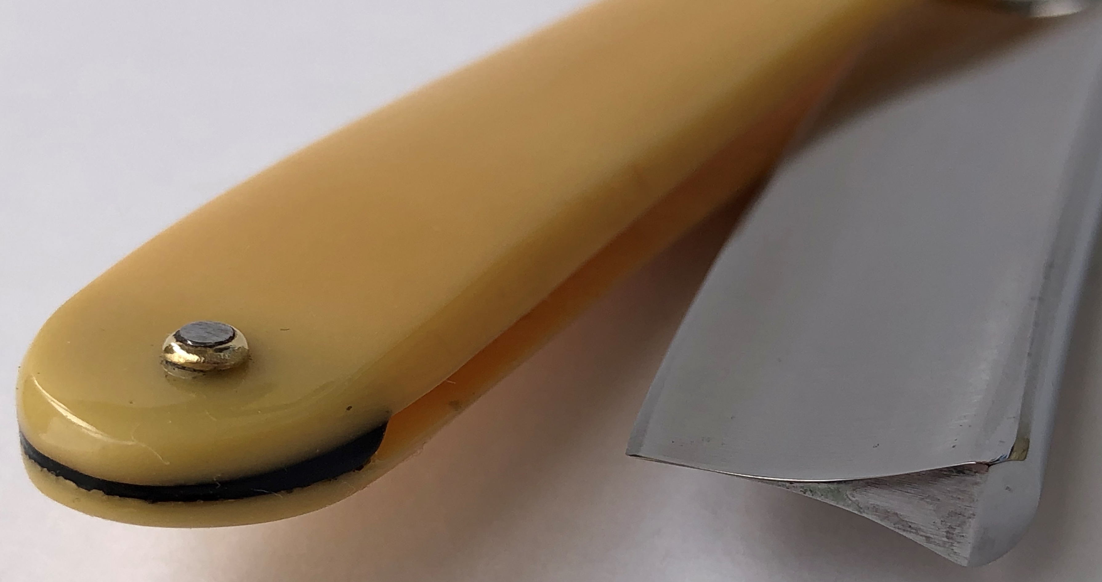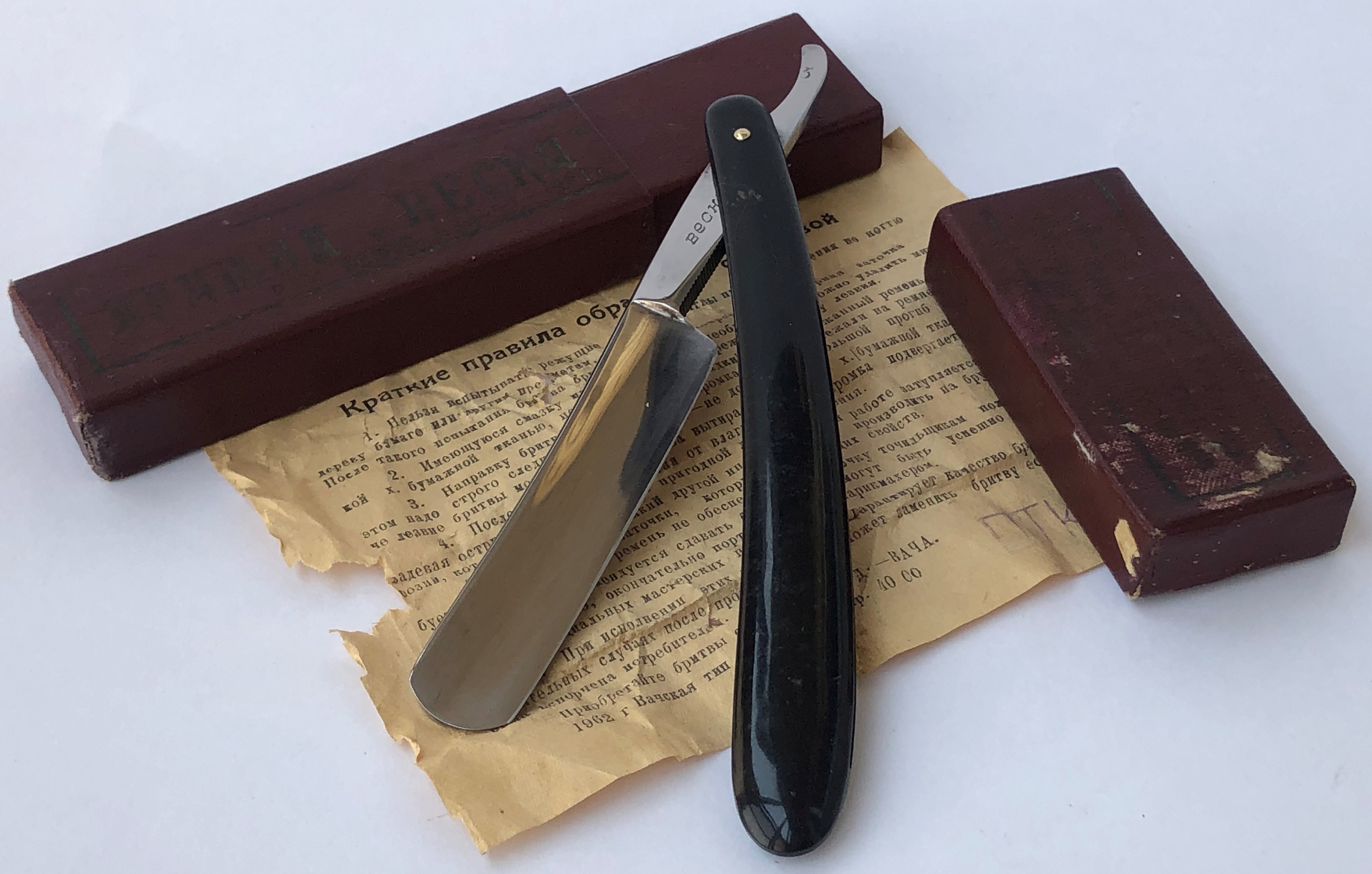Такие ручки ставили на профессиональные "ПАРИКМАХЕРСКИЕ" модели за номером 1 от Вачи.(Может еще на какие, не помню).Смею предположить, что и эта более узкая "ВЕСНА" предназначалась для парикмахерского использования. Идеальная геометрия полотна:кромочка равномерна по всей длине.Родная коробочка(61 г.в) и инструкция(62 г.в.) в комплекте!