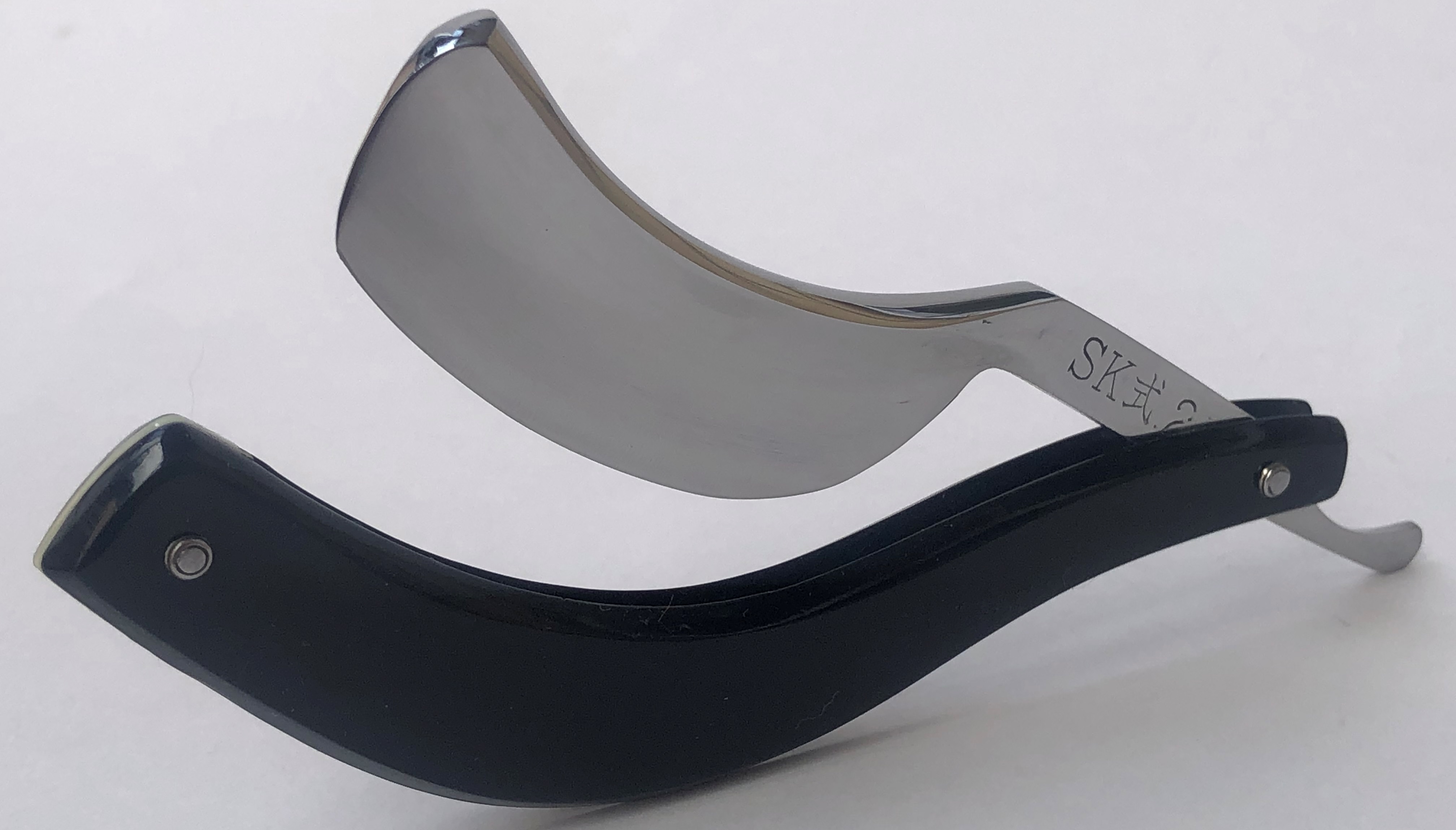 Бритва без следов пользования и по всей видимости в работе еще не была.Разобрал, для удаления незначительных "следов времени" и заново собрал, сохранив родные пины , а также добавив внутренние шайбы, для порядка.Бритва в идеальном состоянии, практически как вчера с завода. Кромочка тоненькая.Эффектные и удобные пластиковые накладки на эрле, дают возможность не так ответственно следить за районом осевого пина после бритья и не пропустить образование ржавчины в этом месте. Эта модель немного легче своих "цельнометаллических" собратьев такого же размера, но ко всему можно привыкнуть, так что для кого то это станет преимуществом и бОльшим удобством, чем пользование обычной бритвой.А избыточно толстый обушок даёт возможность не выставлять угол атаки при бритье, а класть бритву плашмя на лицо и таким образом бриться с самым минимальным углом.Бритва заточена и лично протестирована. Напомнила мне английские бритвы с полной вогнутостью, начала 20-го века. Такая же комфортная сталь, средней твердости, с характерным "шелестом" сбриваемой щетины. После бритья кромочка прекрасно проходила тест на рез волоса на весу,без правки на ремне.