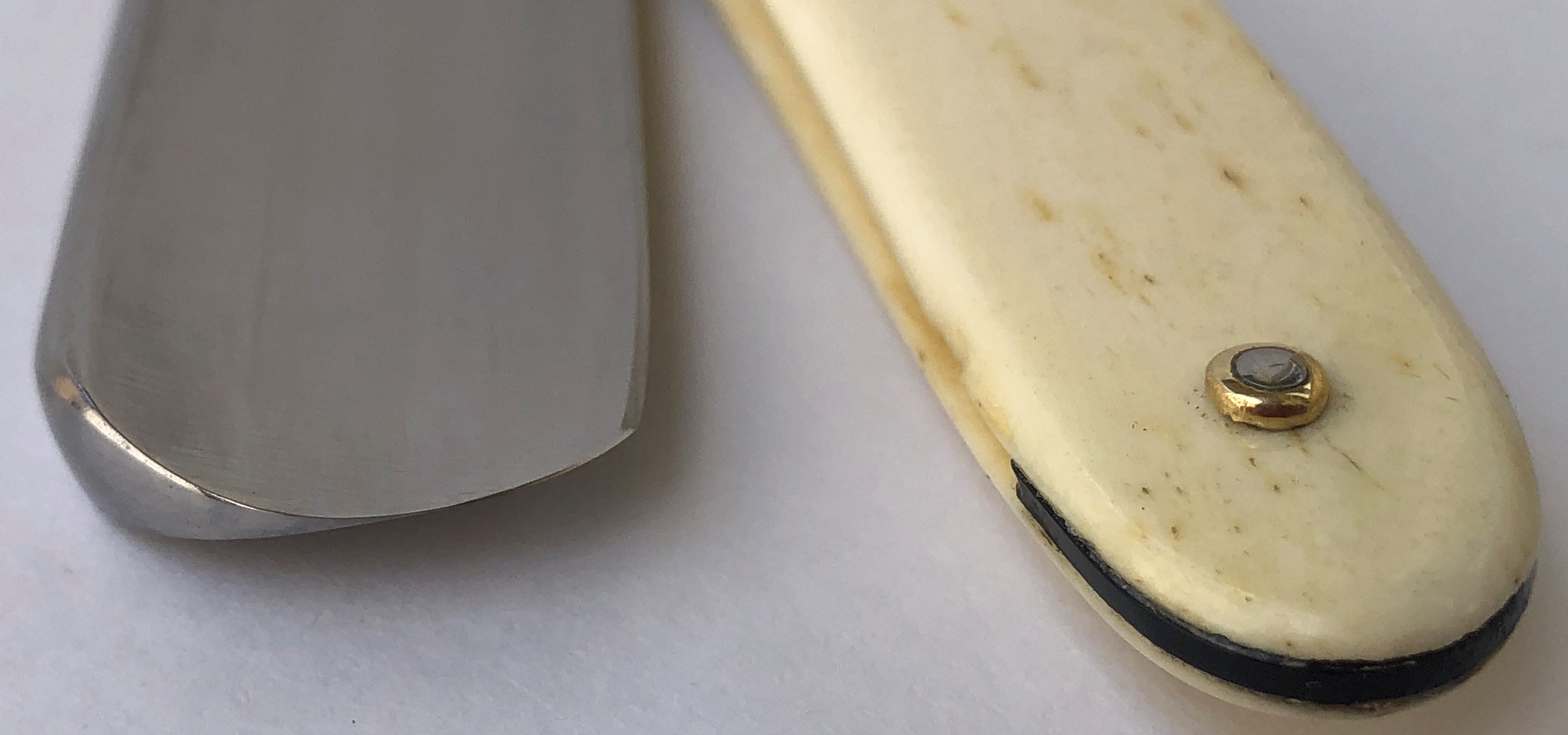 Бритва без признаков пользования. Клинок был немного освежён от следов древней патины.Идеальная геометрия полотна. Кромочка равномерна по всей длине. Шикарная оправа из натуральной кости.Микротрещинка(практически незаметная) в районе нижнего пина была намертво проклеена в обеих сторон и никак не повредит дальнейшей эксплуатации.Новые двух-цветные втулки, а также внутренние шайбы.Достаточно тяжёлая бритва, с удобной формой лезвия, что очень хорошо ,особенно для новичка.На мой взгляд очень красивая бритва.