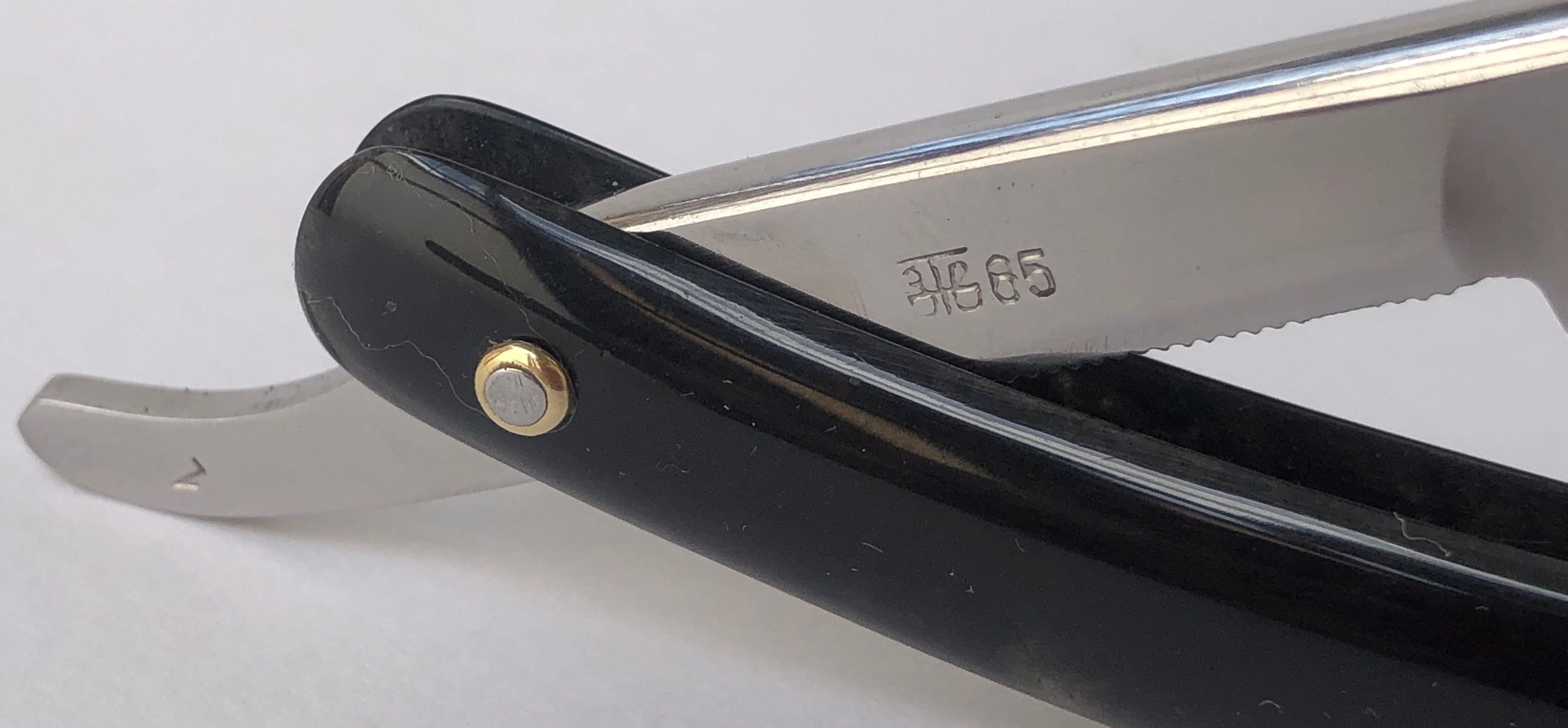 Клинок привел в порядок, убрал небольшую утОчку обушка, перешлифовал и умеренно отполировал."Cледы времени" в районе осевого пина оставил, для придания старинному клинку естественного вида.Родную ручку заменил на другую, пластиковую.Внутренние шайбы и новые втулки поставил.Кромочка ровненькая по всей длине.Парикмахерская метка. На мой взгляд, очень неплохая и недорогая бритва из прошлого.