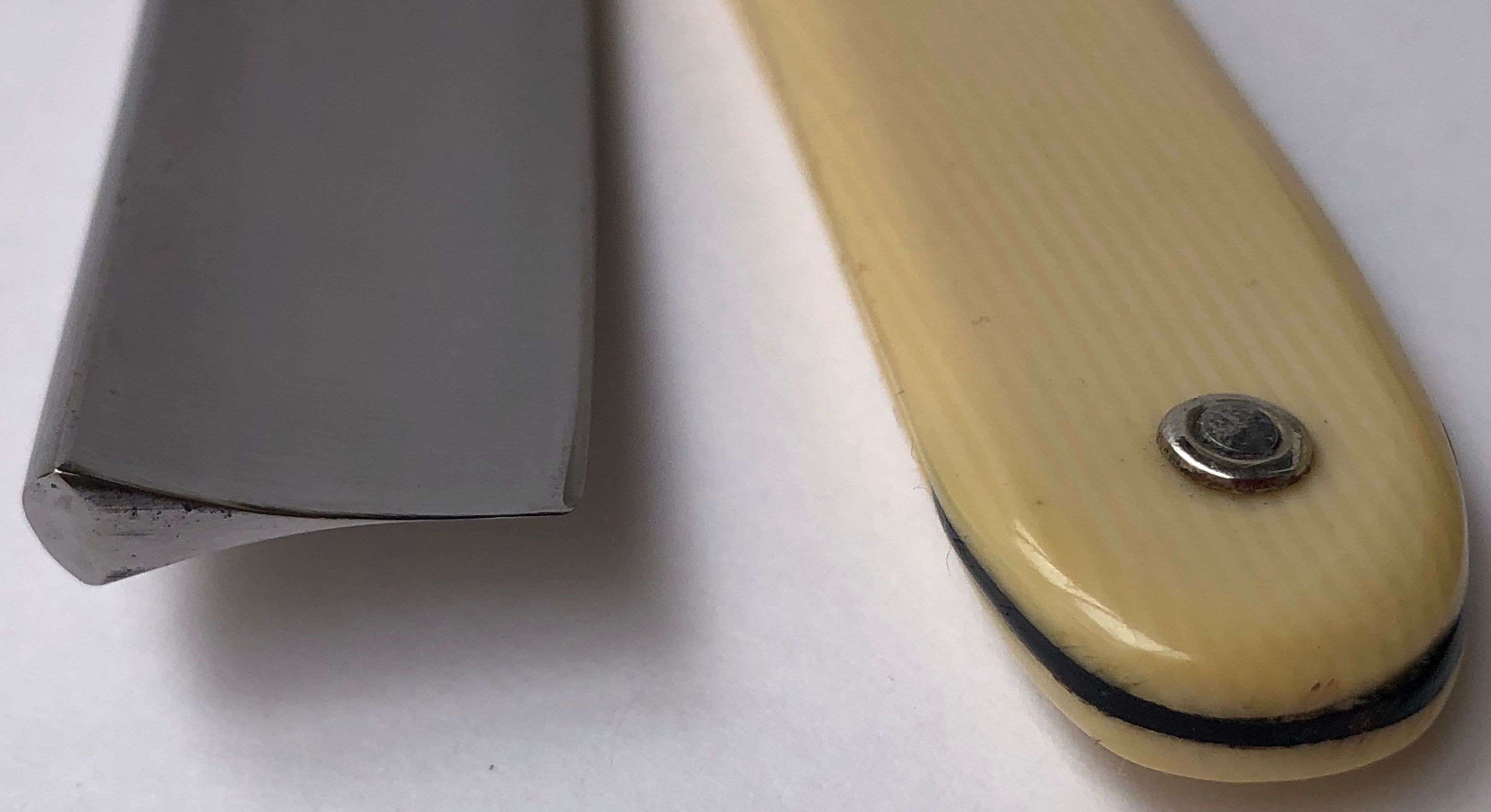 Клинок идеальный и ни разу не точился. Имеет оригинальную шлифовку и полировку полотна. Разобрал, чтобы установить внутренние шайбы и убрать радиальные царапины на эрле.Оригинальный пин установил обратно, так что сложно сейчас заметить.Можно сказать, что бритва как вчера с завода.Идеальная геометрия полотна:кромочка равномерна по всей длине.Родная коробочка того же 1958 года в комплекте!