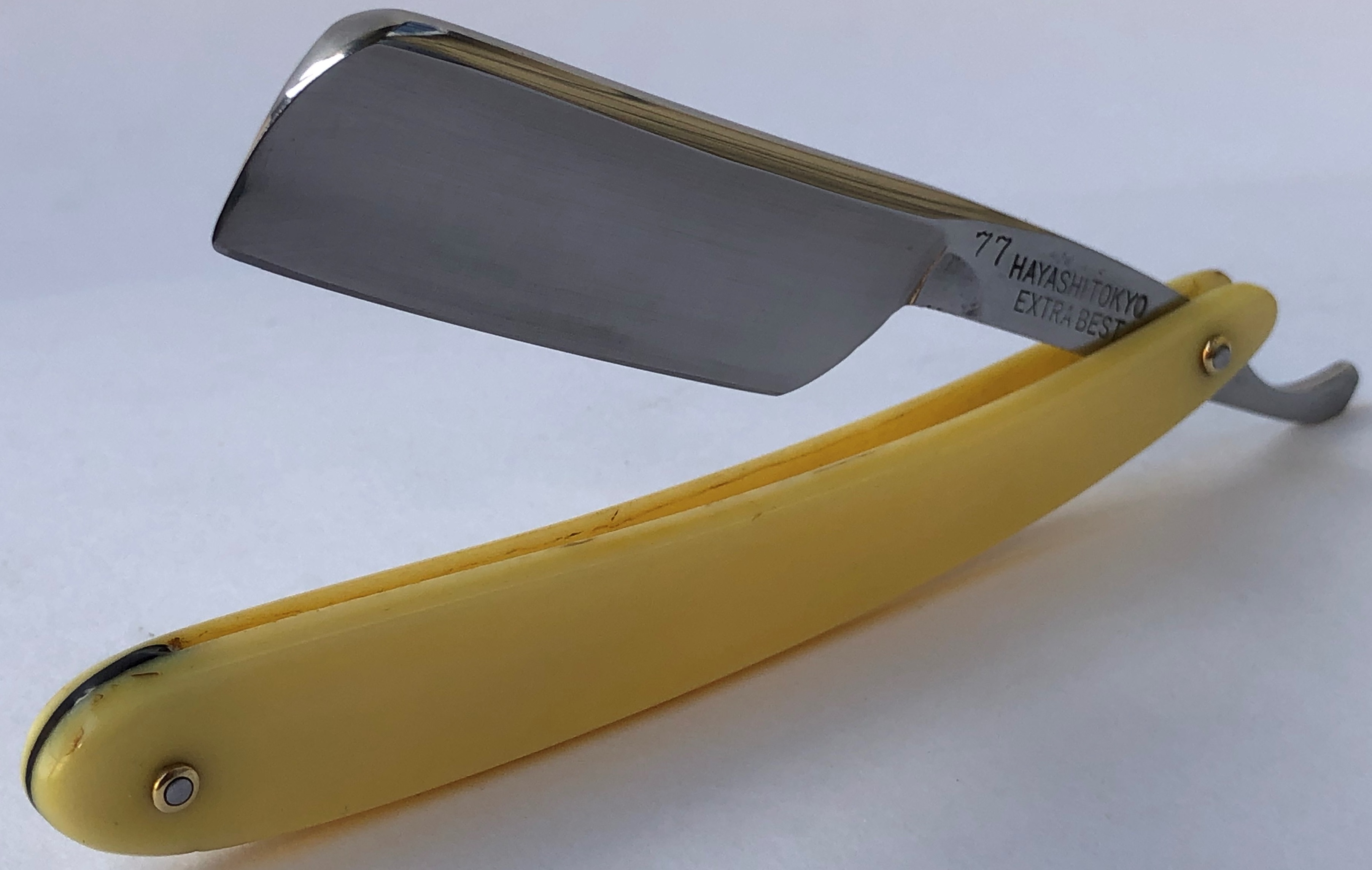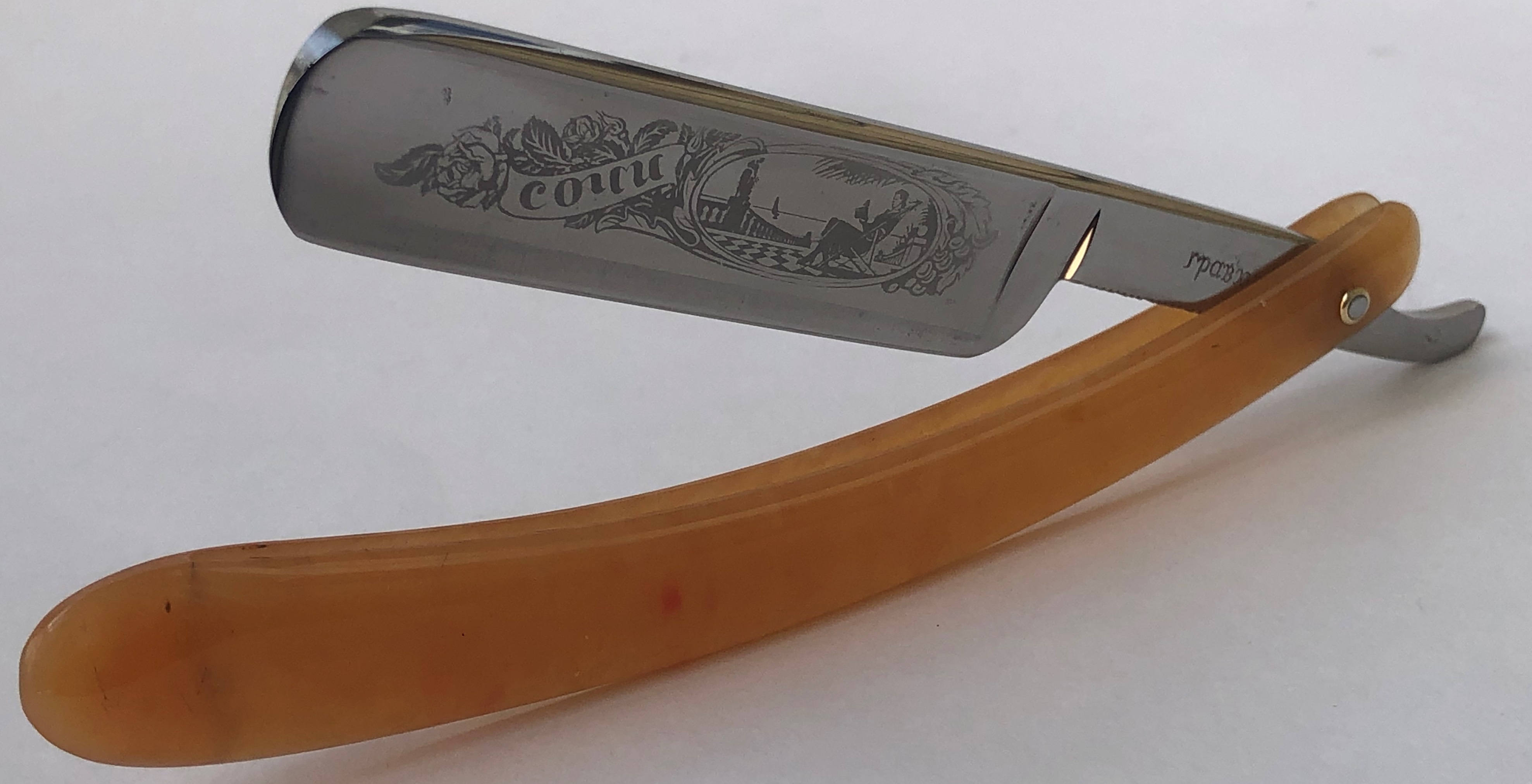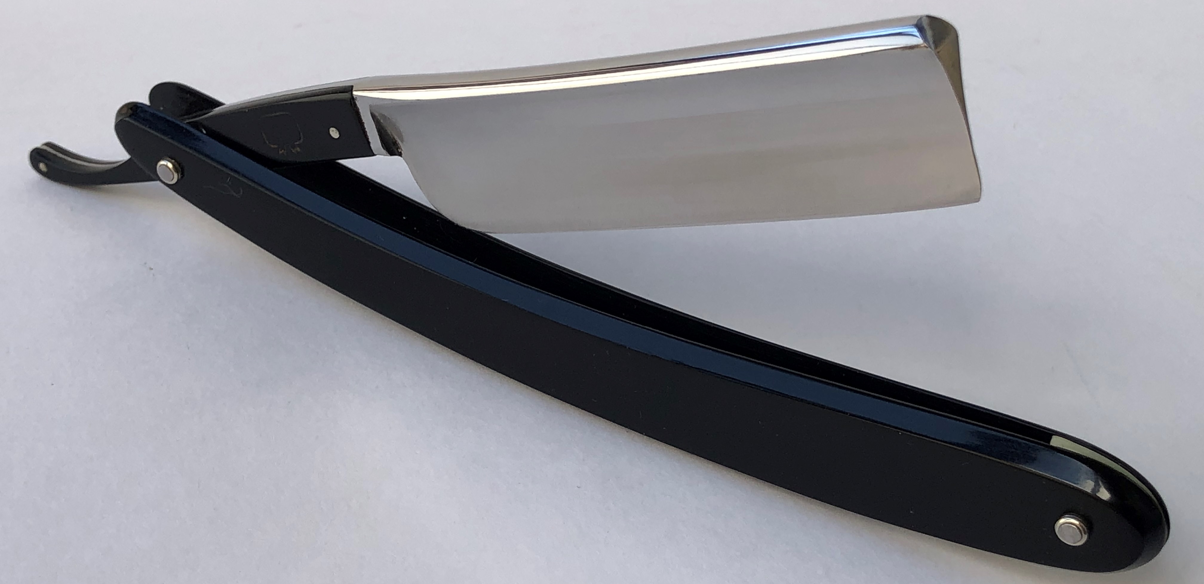 Бритва без следов пользования и по всей видимости в работе еще не была.Разобрал, для удаления незначительных "следов времени" и заново собрал, сохранив родные пины , а также добавив внутренние шайбы, для порядка.Бритва в идеальном состоянии, практически как вчера с завода. Кромочка тоненькая.Эффектные и удобные пластиковые накладки на эрле, дают возможность не так ответственно следить за районом осевого пина после бритья и не пропустить образование ржавчины в этом месте. Эта модель немного легче своих "цельнометаллических" собратьев такого же размера, но ко всему можно привыкнуть, так что для кого то это станет преимуществом и бОльшим удобством, чем пользование обычной бритвой.А избыточно толстый обушок даёт возможность не выставлять угол атаки при бритье, а класть бритву плашмя на лицо и таким образом бриться с самым минимальным углом.Бритва заточена и лично протестирована. Напомнила мне английские бритвы с полной вогнутостью, начала 20-го века. Такая же комфортная сталь, средней твердости, с характерным "шелестом" сбриваемой щетины. После бритья кромочка прекрасно проходила тест на рез волоса на весу,без правки на ремне.