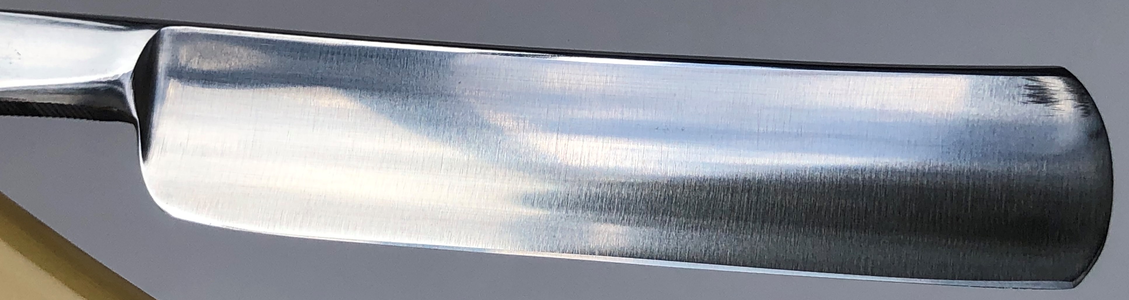 Внимание!Полотно имеет дефект. На удалении 8 мм от пятки имеется неглубокая микро-трещинка.Почти не видно на фото и на яву. При бритье не должна никоим образом беспокоить, так как эта часть полона практически не участвует в процессе.Трещинка "не гуляет" ,а сам клинок в районе кромки имеет достаточную жесткость. Поэтому принял решение подготовить бритву для использования. Бритва перед отправкой будет заточена и подготовлена в бритью.