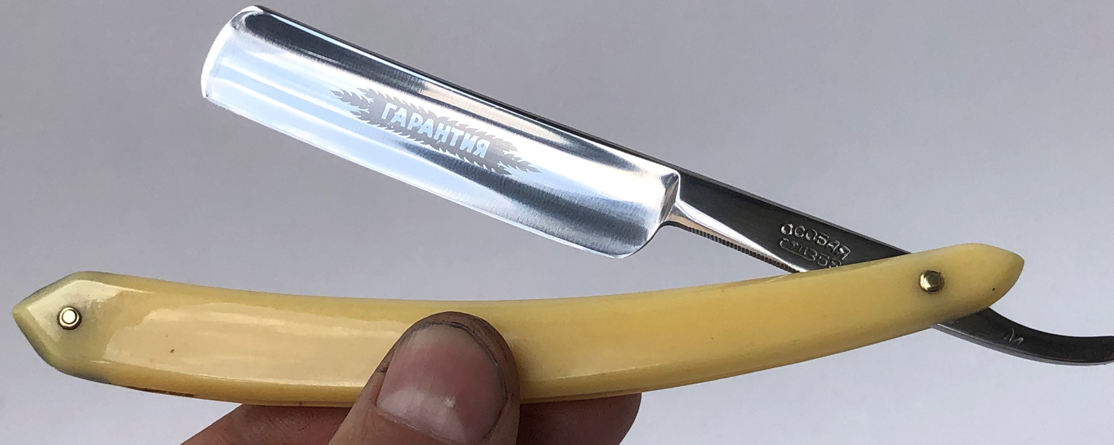 Бритва без следов пользования и по всей видимости в работе еще не была.Разобрал, для удаления незначительных "следов времени" и заново собрал, сохранив родные пины , а также добавив внутренние шайбы, для порядка.Бритва в идеальном состоянии, практически как вчера с завода. Кромочка тоненькая.Эффектные и удобные пластиковые накладки на эрле, дают возможность не так ответственно следить за районом осевого пина после бритья и не пропустить образование ржавчины в этом месте. Эта модель немного легче своих "цельнометаллических" собратьев такого же размера, но ко всему можно привыкнуть, так что для кого то это станет преимуществом и бОльшим удобством, чем пользование обычной бритвой.А избыточно толстый обушок даёт возможность не выставлять угол атаки при бритье, а класть бритву плашмя на лицо и таким образом бриться с самым минимальным углом.Бритва заточена и лично протестирована. Напомнила мне английские бритвы с полной вогнутостью, начала 20-го века. Такая же комфортная сталь, средней твердости, с характерным "шелестом" сбриваемой щетины. После бритья кромочка прекрасно проходила тест на рез волоса на весу,без правки на ремне.