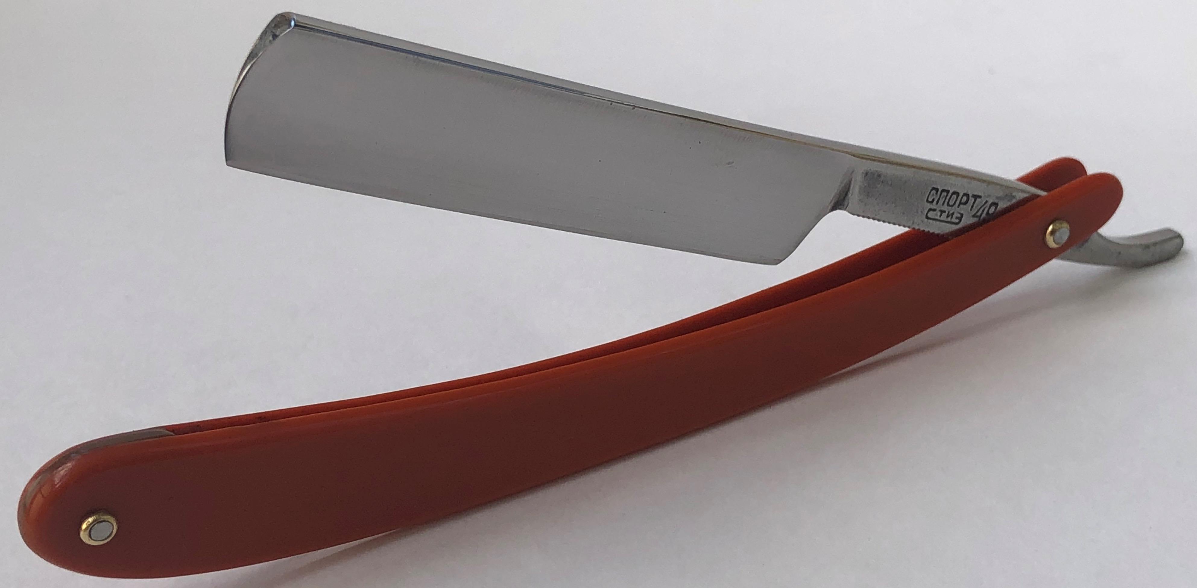 Бритва без следов пользования и по всей видимости в работе еще не была.Разобрал, для удаления незначительных "следов времени" и заново собрал, сохранив родные пины , а также добавив внутренние шайбы, для порядка.Бритва в идеальном состоянии, практически как вчера с завода. Кромочка тоненькая.Эффектные и удобные пластиковые накладки на эрле, дают возможность не так ответственно следить за районом осевого пина после бритья и не пропустить образование ржавчины в этом месте. Эта модель немного легче своих "цельнометаллических" собратьев такого же размера, но ко всему можно привыкнуть, так что для кого то это станет преимуществом и бОльшим удобством, чем пользование обычной бритвой.А избыточно толстый обушок даёт возможность не выставлять угол атаки при бритье, а класть бритву плашмя на лицо и таким образом бриться с самым минимальным углом.Бритва заточена и лично протестирована. Напомнила мне английские бритвы с полной вогнутостью, начала 20-го века. Такая же комфортная сталь, средней твердости, с характерным "шелестом" сбриваемой щетины. После бритья кромочка прекрасно проходила тест на рез волоса на весу,без правки на ремне.
