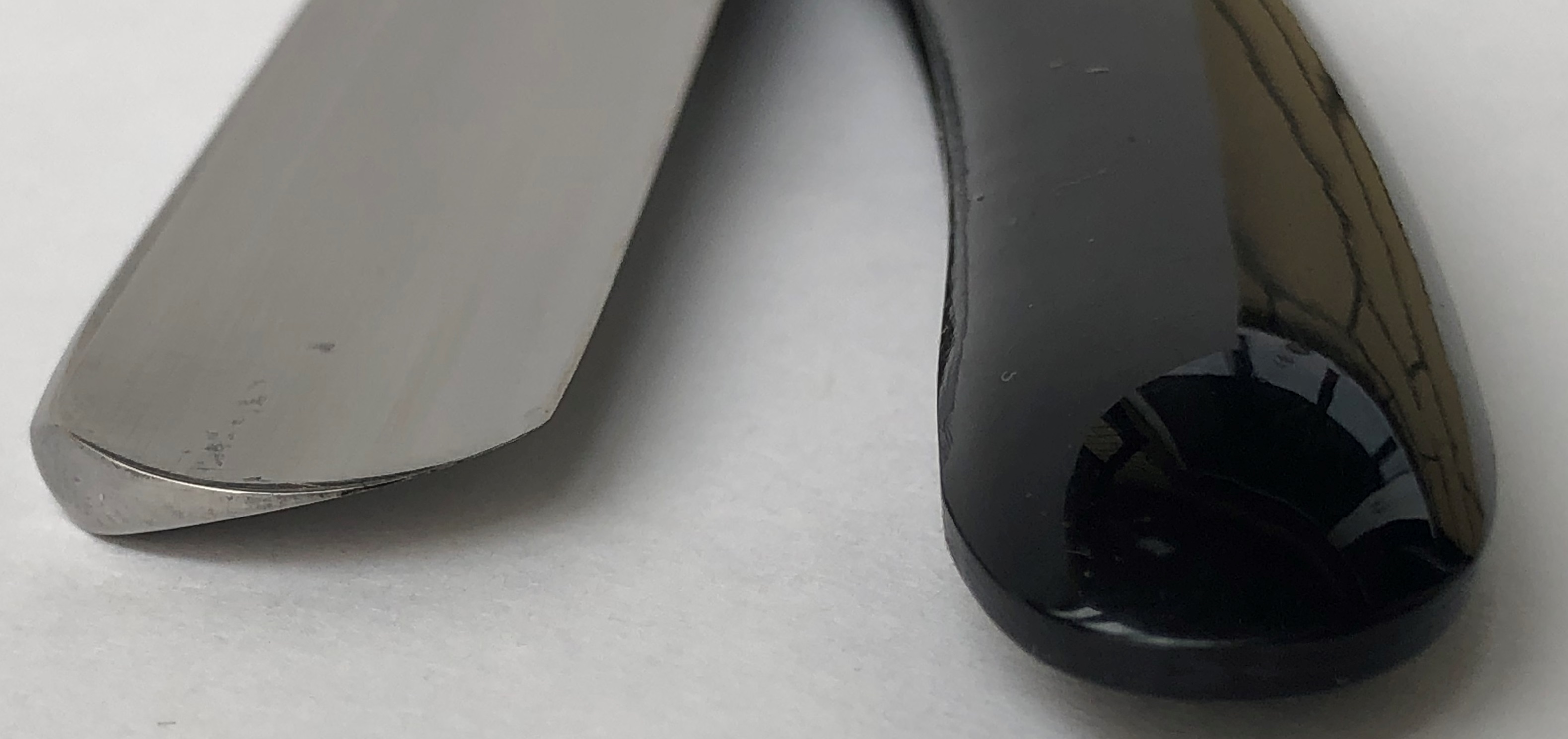Довольно редко встречающаяся модель бритвы.Хочу обратить внимание, что форма лезвия является оригинальной, а не следствие каких то работ.(За 13 лет попадается третья и везде форма клинка была такая же).Если мне не изменяет память, то это единственная модель Хенка, с таким "гранёным" обушком.