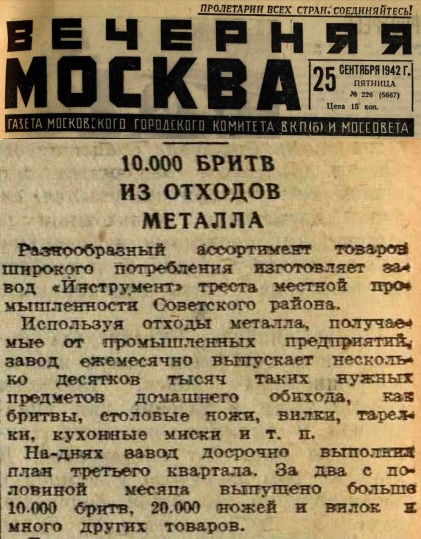 газета "Вечерняя Москва", 25 сентября 1942 года Для изготовления бритв использовали отходы металла, получаемые от промышленных предприятий В третьем квартале было выпущено 10 000 бритв. Но, мы то знаем, что за 1942 год было выпущено 31 801 бритва. Значит металл подвозили не равномерно и план по бритвам не выполнялся. И уже 19 ноября в статье "Производство товаров ширпотреба в Советском районе" разгромная заметка о невыполнении плана: