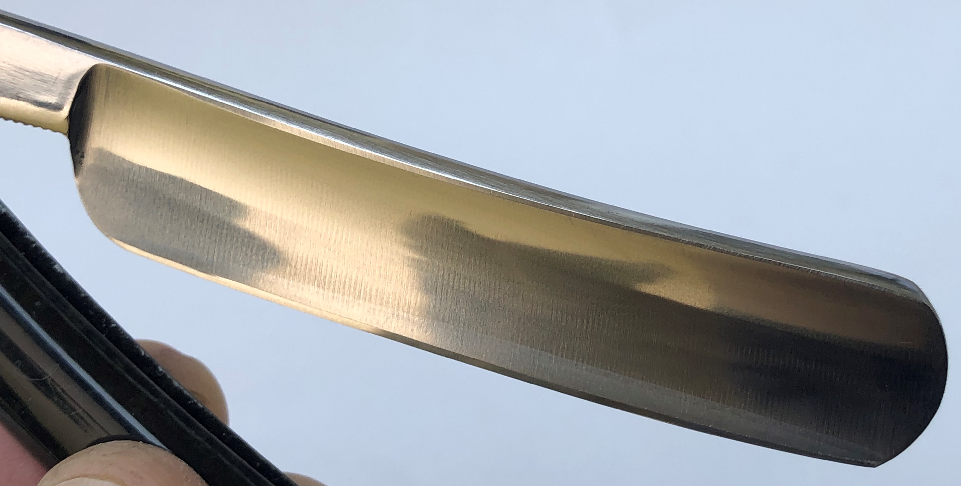 Бритва без следов пользования,но пришлось разобрать, для удаления следов окисления в районе осевого пина.Заменил медную заклепку на двух-цветную втулку,а также добавил внутренние шайбы.Заводская шлифовка и полировка полотна. Идеальная геометрия:кромочка равномерна по всей длине полотна.Очень хороший и недорогой вариант для новичка..