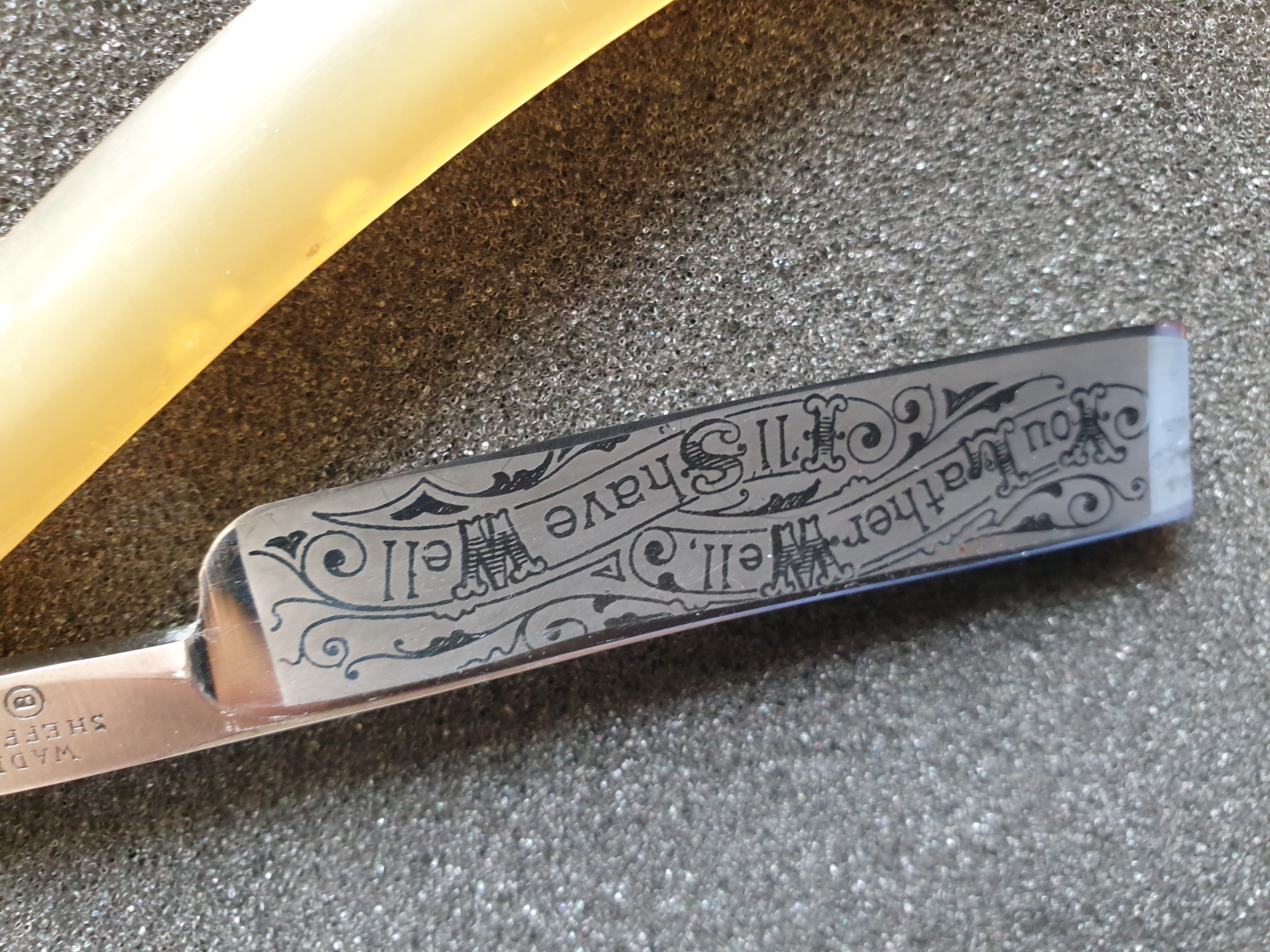 Продаётся от S&T97. Wade&Butcher Шеффилд, конец XIX - начало XX века. Клин, травление на клинке "Ты только намыль хорошенько, а уж я то побрею достойно". Ширина клинка 17мм, ручка из медового рога, футляр в комплекте. Всё родное, коллекционное состояние. Бритва не разбиралась, сделана свежая заточка на японских камнях.