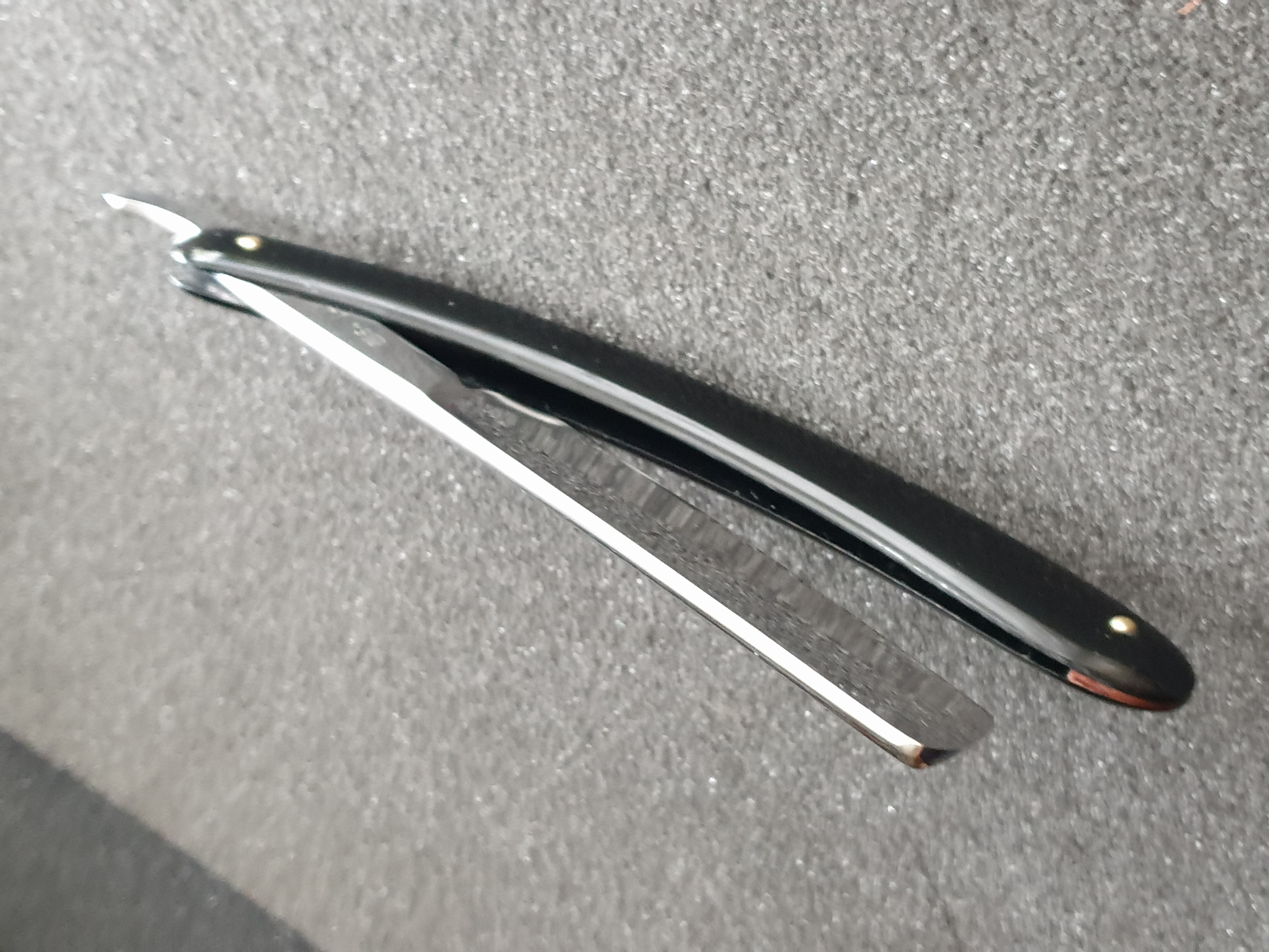 Продаётся от S&T100. Bengall, Шеффилд, XIX век. Форма - клин, ручка из рога с клинышком из олова, ширина клинка 15мм, все родное, ручка без выгрызов и прочих дефектов, отличная геометрия клинка, бритва не разбиралась, не шкурилась, сделана только свежая заточка на японских камнях.
