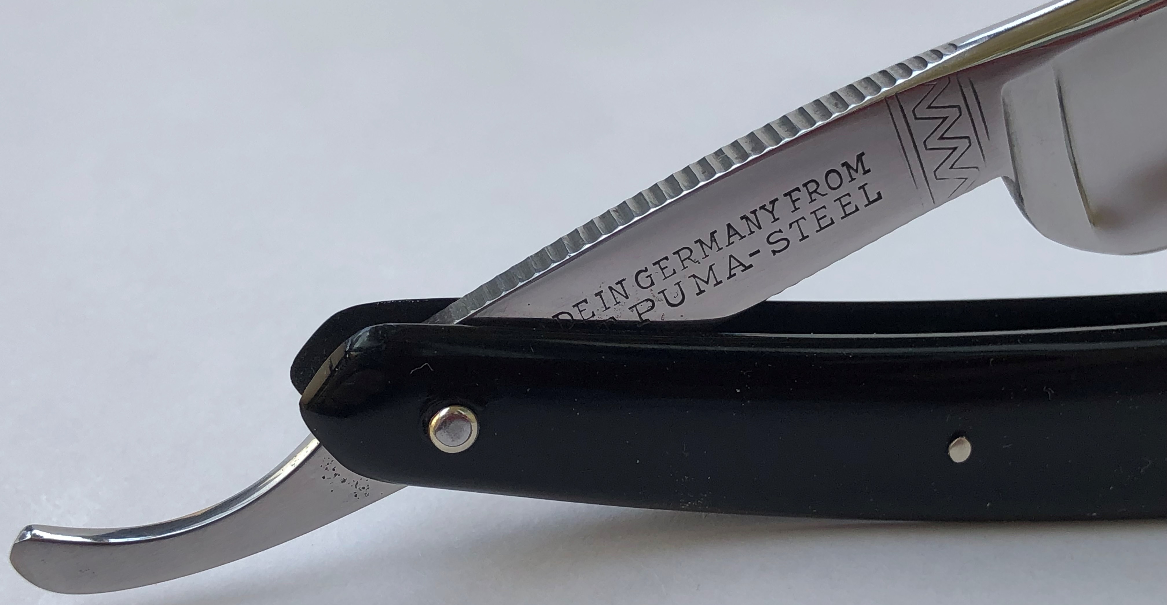 Бритва без следов пользования,но пришлось разобрать, для удаления следов окисления в районе осевого пина.Заменил медную заклепку на двух-цветную втулку,а также добавил внутренние шайбы.Заводская шлифовка и полировка полотна. Идеальная геометрия:кромочка равномерна по всей длине полотна.Очень хороший и недорогой вариант для новичка..