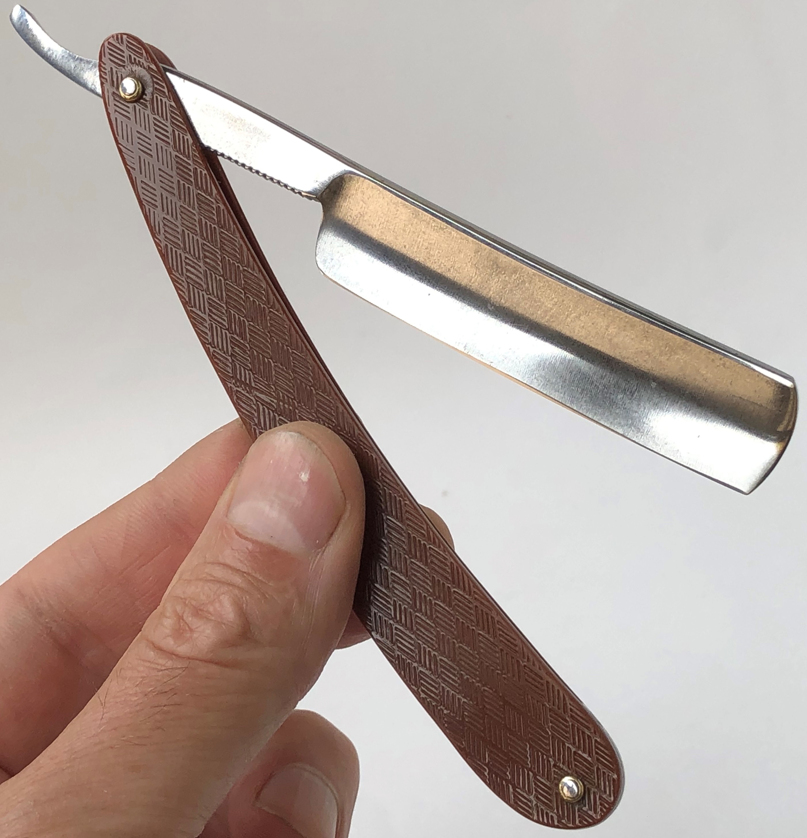 Довольно редко встречающаяся модель бритвы.Хочу обратить внимание, что форма лезвия является оригинальной, а не следствие каких то работ.(За 13 лет попадается третья и везде форма клинка была такая же).Если мне не изменяет память, то это единственная модель Хенка, с таким "гранёным" обушком.
