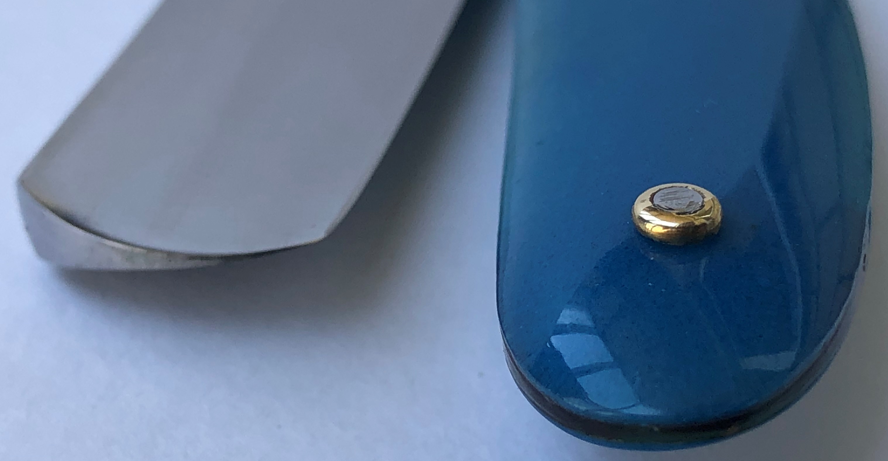 Бритва в очень хорошем состоянии.Непонятно, была ли в пользовании или нет, так как следов на обушке от заточных камней не наблюдается, но ширина полотна неоригинальна.Возможно был изначально скол, а может быть просто правильная и профессиональная эксплуатация.Бритва была разобрана для удаления следов окисления и царапин.Добавил внутренние шайбы и поставил втулку.Кромочка почти равномерна по всей длине. Сталь чистая от видимых дефектов.