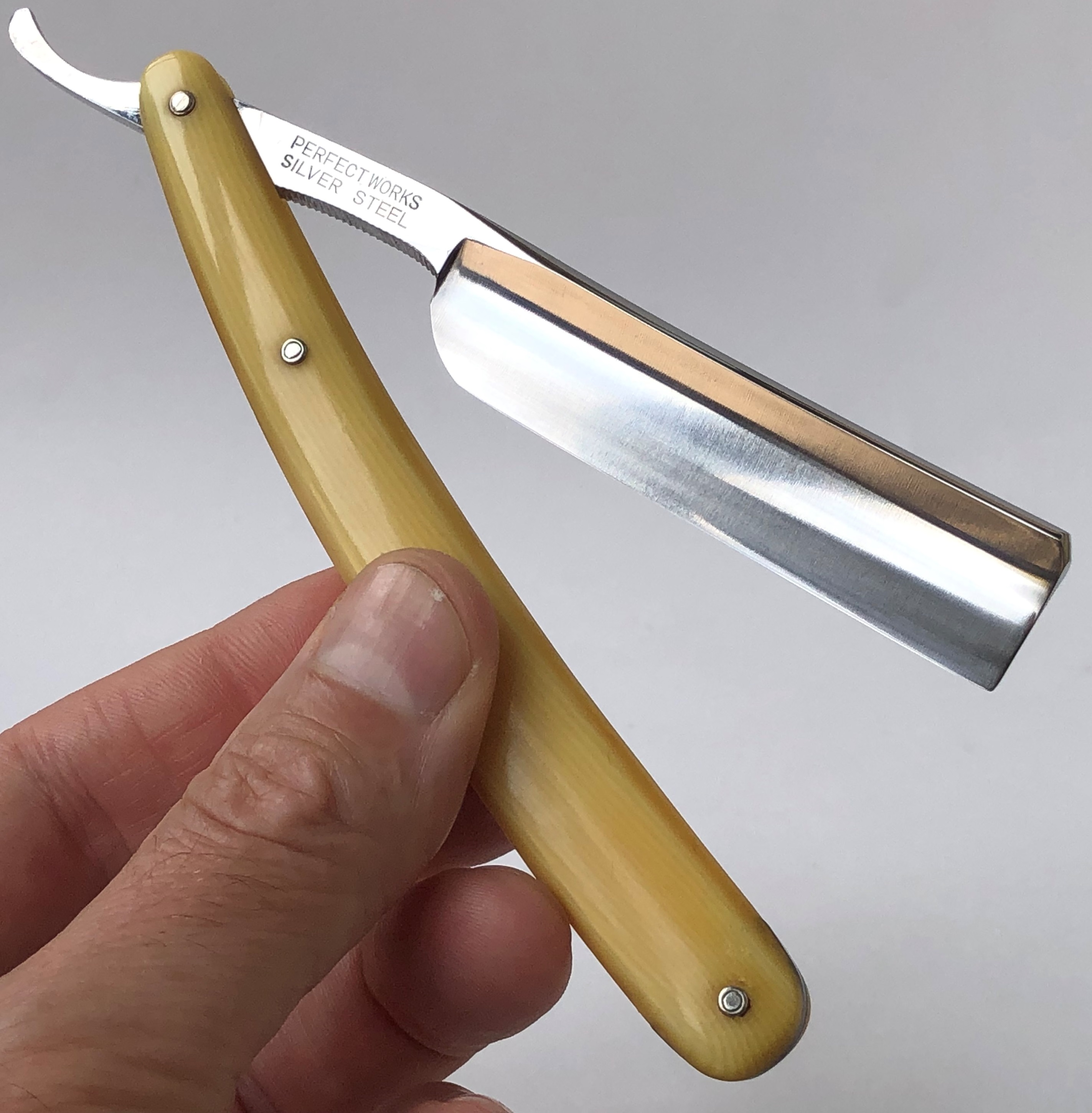 Бритва в очень хорошем состоянии.Непонятно, была ли в пользовании или нет, так как следов на обушке от заточных камней не наблюдается, но ширина полотна неоригинальна.Возможно был изначально скол, а может быть просто правильная и профессиональная эксплуатация.Бритва была разобрана для удаления следов окисления и царапин.Добавил внутренние шайбы и поставил втулку.Кромочка почти равномерна по всей длине. Сталь чистая от видимых дефектов.