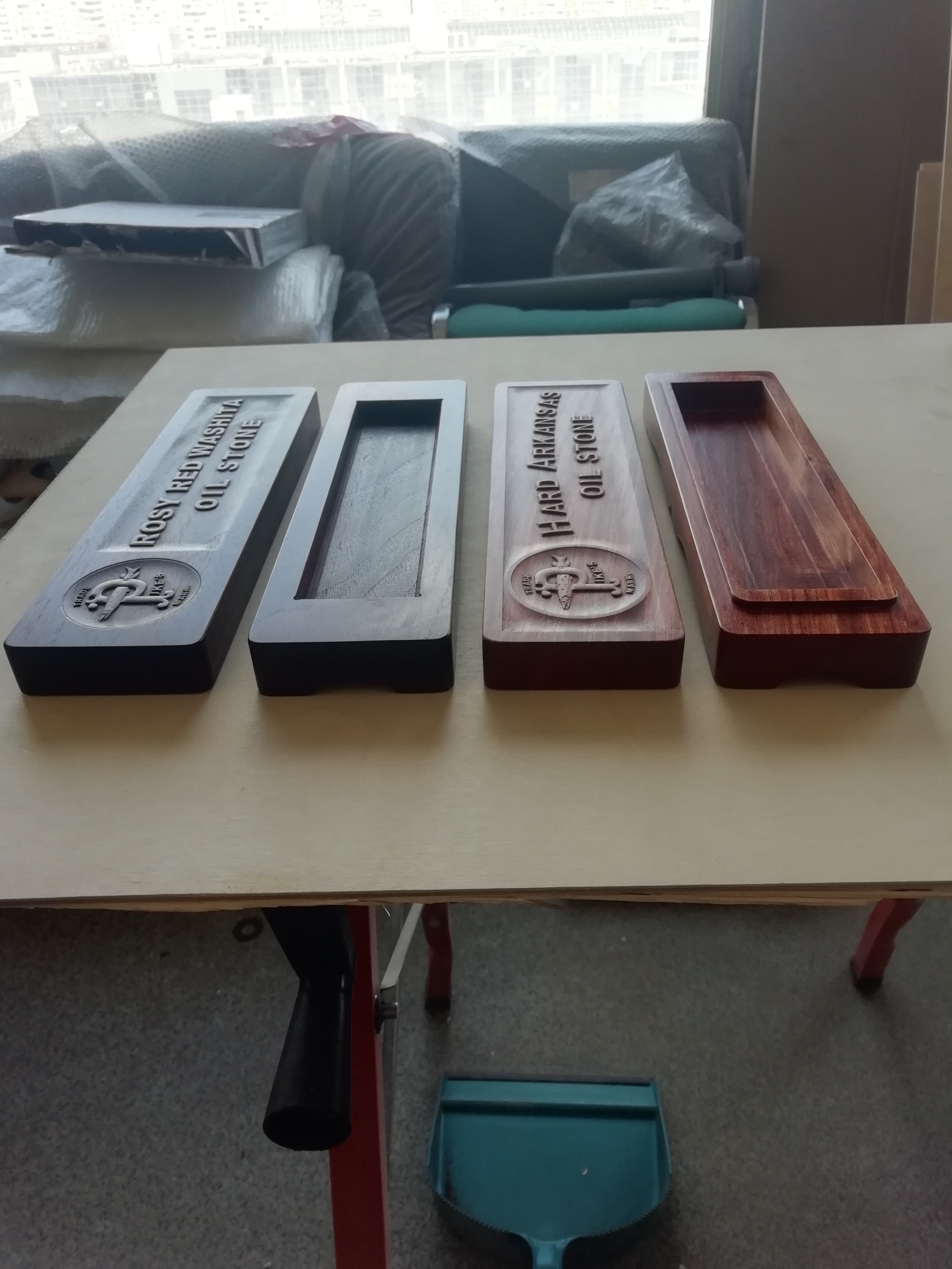 4 футляра для комрада, ныне отбывшего в Персию, для заточных камней в минималистическом исполнении, без украшательств, слева направо: 2 ясеня, сапели, черный орех кавказ (соответственно ЧФ, тюринг, вашита, япнат киита и тома+кома).
