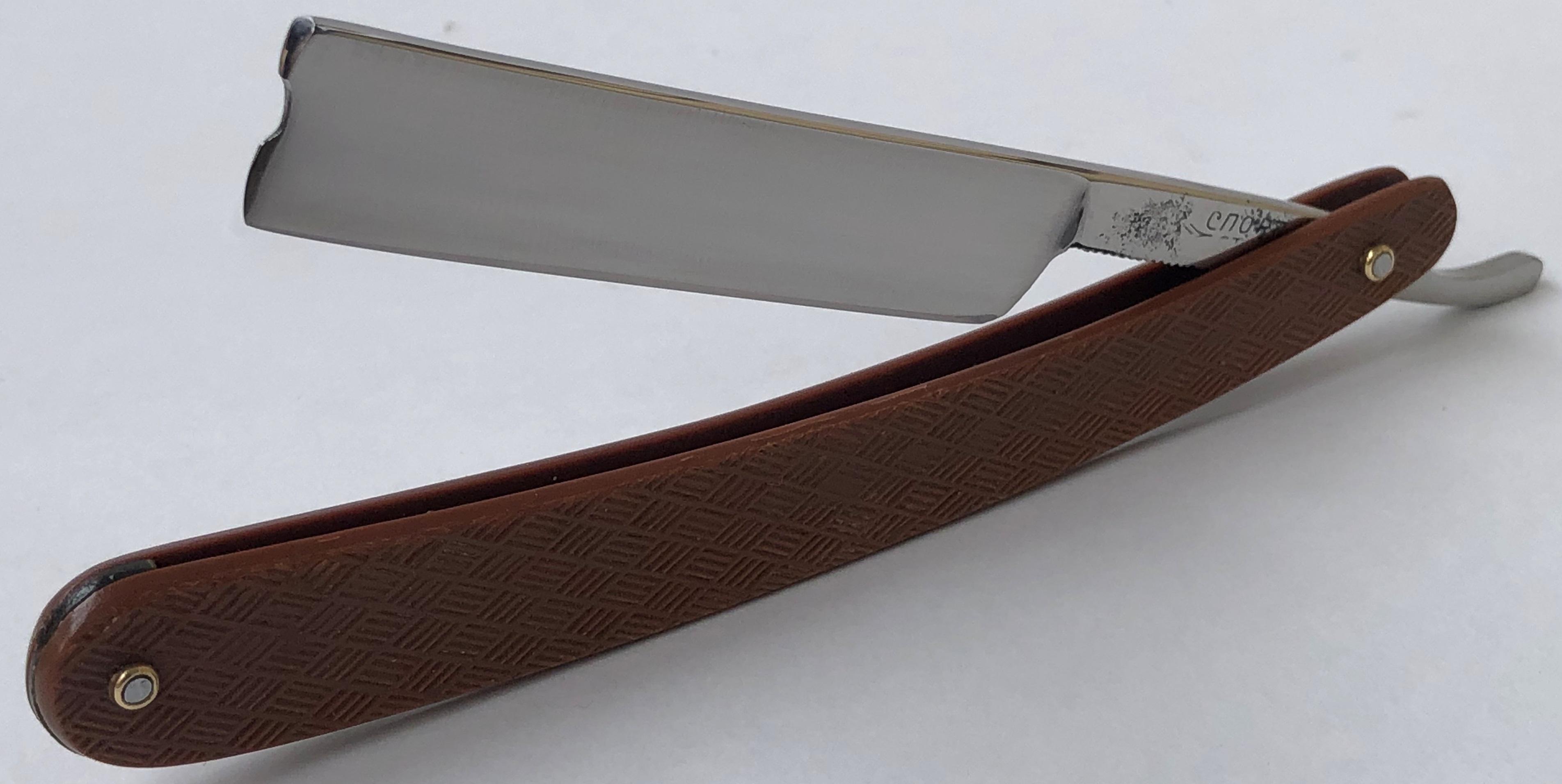 Бритва сохранилась очень хорошо. Немного откорректировал утОчку обушка, заново перешлифовал и умеренно отполировал.Рытвинки в районе осевого пина оставил, чтобы не убирать лишнего, да это собственно и не нужно.На сколько известно, данная модель бритвы комплектовалась рифлёной оправой из прессованного картона. Не стал переустанавливать родную оправу, а поменял ее на примерно такую же(и того же периода производства), только пластиковую , от Труд Вача.Новые пины и внутренние шайбы, для надежности. Очень приятная, не часто встречающаяся, элегантная бритва.Заточена и готова к бритью.
